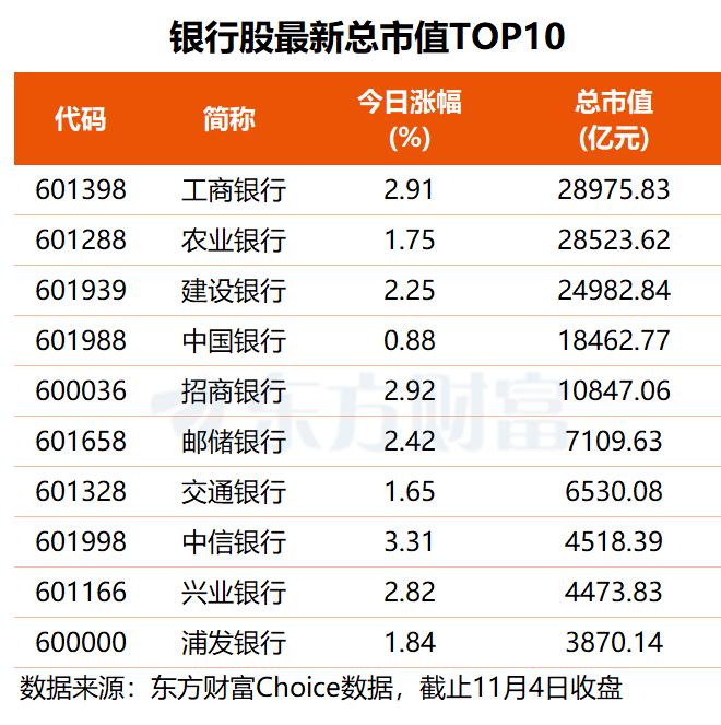 炒股第一步,先开个股票账户 A股三大股指今日震荡走低,截至收盘,沪指跌0.41%,深成指、创业板指分别跌1.71%和1.96%,上证50指数跌0.11%。沪深两市成交额降至1.92万亿元,较昨日缩量超1900亿元。个股也是跌多涨少,全市场共3650股飘绿,但仍有67只个股收盘涨停。 板块方面,今日市场风格切换明显,银行股集体大涨,福建自贸区板块涨幅居前,冰雪产业、旅游酒店等消费板块表现活跃,而能源金属、创新药、机器人等成长板块领跌。 展望后市,招商证券表示,当前市场进入到一段时间的业绩、事件、政策的真空期,缺少决定方向的催化剂,因此市场会进入到一段时间的震荡阶段,以等待年底新的变化。 另有机构指出,从外部环境来看,中美经贸磋商取得阶段性成果,直接缓解市场对外部不确定性的担忧。从国内来看,后续宏观政策有望持续加力,为A股市场营造良好的政策环境,也为资本市场注入稳定的长期预期。叠加上市公司三季报展现出基本面韧性,市场向好趋势不改。短期来看,11月正值政策与业绩空窗期,市场轮动速度或将加快。 银行股全线飘红 工商银行总市值重回榜首 银行板块今日持续走高,除青岛银行收平外,其余41股全部收涨,其中厦门银行大涨近6%,上海银行、江阴银行、中信银行、重庆银行涨幅均超3%。 值得一提的,工商银行今日收涨2.91%,总市值攀升至2.90万亿元,重回A股总市值榜首。农业银行涨1.75%,建设银行涨2.25%,二者总市值分别为2.85万亿和2.50万亿元。 ![]() 国投证券分析认为,观察保险资金对银行股的投资行为,在三季度持续且大幅加仓,配置型资金对银行股的青睐度依然不减。在市场“无人问津”处,银行板块估值与股息对中长期资金吸引力显著增强,其基本面依然稳健,当前配置银行股的性价比不错。 中国银河证券日前研报指出,从资金面来看,在中长期资金入市的背景下,红利板块有望受到更多资金的青睐。险资、社保、养老金等中长期资金属性与红利板块低波动、高股息的特性具有更高匹配度。 福建板块全天强势 19股封涨停 福建板块今日再度掀起涨停潮,共有19只个股收盘涨停,其中中能电气、海峡创新、招标股份20cm涨停,平潭发展、漳州发展、厦工股份、福龙马等热门股盘初异动后,全天稳稳封板。丁冬财经Choice数据显示,福建板块今日获主力净流入9.82亿元,在地区板块中一枝独秀。 ![]() 消息面上,在日前召开的世界航海装备大会上,福建省共对接签约项目172项、总投资超2000亿元,其中集中签约项目50个、总投资991.5亿元。 此外,福建自贸区、平潭综合实验区等平台建设通过制度创新和产业升级,正推动区域经济高质量发展,展现出巨大潜力。 冰雪产业等消费板块逆势上涨 部分消费板块今日亦表现活跃,冰雪产业、旅游酒店概念股明显上涨,其中大连圣亚、雪人集团封涨停,晶雪节能大涨超13%,长白山、西域旅游、岭南控股等多股跟涨。 消息面上,10月26日起,全国民航已正式执行2025/2026年冬春航季航班计划,新航季共计154天。值得注意的是,新航季重点加强了“北上滑雪”和“南下避寒”等航线的运力投入。 同时,美团旅行数据显示,10月中旬以来,“室外滑雪场”搜索量同比上涨近900%,开板较早的可可托海国际滑雪度假区搜索量上涨279%,哈尔滨冰雪大世界景区日均搜索量环比上涨近163%。 机构表示,在当前支撑经济平稳增长、提振内需成为核心路径的背景下,服务消费正加速迈向居民消费主体地位。《关于扩大服务消费的若干政策措施》中多项举措预计逐渐落地显效,服务消费各细分领域将持续受益于政策红利,建议关注文旅、体育等方向。