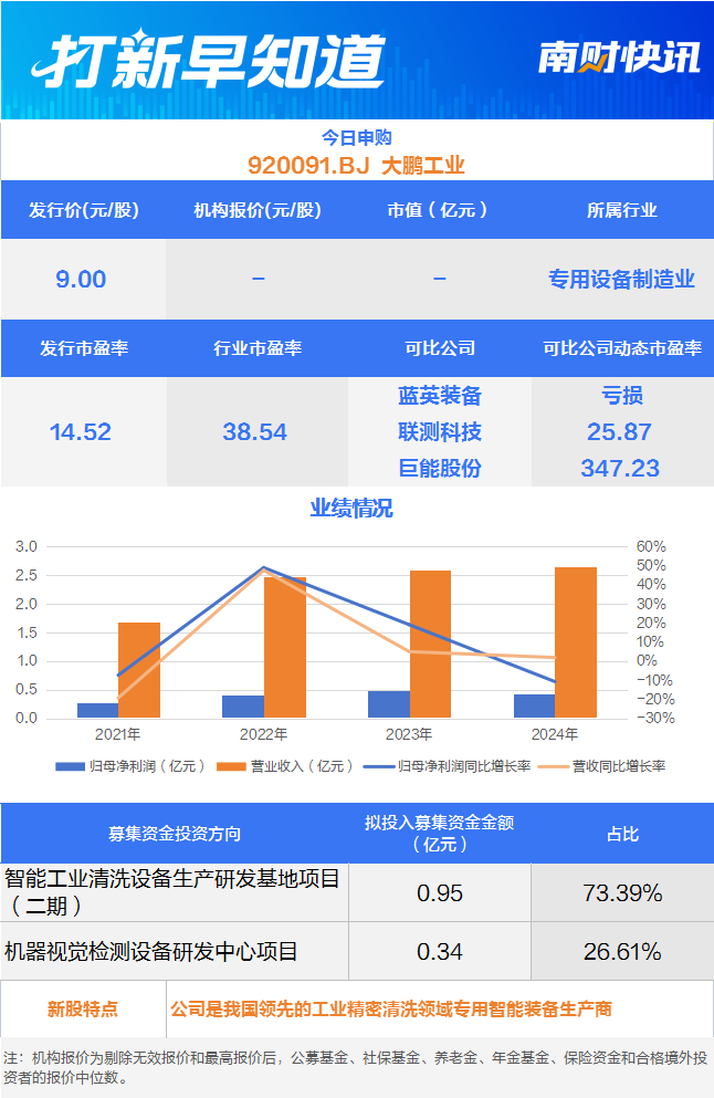 工业清洗隐形冠军 比亚迪“小伙伴”今日申购 另有一只新股上市丨打新早知道 炒股第一步,先开个股票账户 11月5日,有一只新股申购,为北交所的大鹏工业(920091.BJ),另有一只新股上市,为沪市主板的丰倍生物(603334.SH)。 一只新股申购 大鹏工业是我国领先的工业精密清洗领域专用智能装备生产商,产品及服务主要应用于车辆动力总成、新能源三电系统等核心零部件的精密清洗领域,以满足下游客户的精密制造需求。同时,公司积极把握我国制造业高质量发展趋势,在现有业务技术经验及市场资源等基础上,加速布局机器视觉检测产品,形成企业发展的第二曲线。 ![]() 据招股书介绍,大鹏工业的专用智能装备产品主要应用于自动化机加工生产线和装配线上,能与各类加工设备等机械设备共同组成生产线,使原材料完成预定的加工、装配过程,最终形成合格产品。 其中,公司的工业精密清洗装备主要应用于传统燃油汽车、混合动力车辆的动力总成和新能源车辆“三电”系统的核心零部件生产线,在清洁度、生产节拍、智能化水平等方面均达到国际领先水平。 而据招股书介绍,大鹏工业在为客户提供服务时,察觉到通用机器视觉检测产品在大尺寸工业零部件的应用场景上存在缺陷检出率低、识别不精准的痛点,认为应用于该领域的机器视觉检测设备有较大成长空间。所以,公司凭借对汽车行业客户质量检测环节的需求理解以及在为客户服务过程中逐渐积累的样本库,通过自主研发以及合作研发等方式,开发出更具针对性的专用算法,并开辟机器视觉检测设备产品线。 目前,大鹏工业是高新技术企业、国家级专精特新“小巨人”企业、国家级新一代信息技术与制造业融合发展试点示范企业、黑龙江省制造业单项冠军企业和新型研发机构,被工业和信息化部评定为“绿色工厂”等。 客户资源方面,大鹏工业已与包括比亚迪、长安集团、吉利汽车、长城汽车、广汽集团、上汽集团、一汽集团、东风汽车、中国重汽、洛阳一拖等主流车企(集团)和潍柴动力、东安股份、爱柯迪、文灿股份、天润工业、陕西法士特、玉柴股份、吉孚传动、小康动力等大型车辆动力总成配套企业建立长期、稳定的合作关系。 不过,大鹏工业在招股书中提醒,公司的客户主要为汽车及汽车零部件制造企业,信用度高、违约风险低,但付款程序较复杂,且主导合同结算过程中的各个环节,从而导致公司回款周期较长,使公司应收账款占销售收入比例较大。 财务数据显示,2022年至2025年6月末,大鹏工业应收账款金额分别为8,962.56万元、8,368.33万元、13,098.77万元及10,994.79万元。大鹏工业提醒,若宏观经济形势、行业发展前景等因素发生不利变化,公司主要欠款客户的资信、生产经营情况发生不利变化,可能导致公司的应收账款回收期延长甚至发生坏账的情况,进而对公司的经营业绩、现金流和正常生产经营活动产生重大不利影响。 一只新股上市 丰倍生物(603334.SH),公司成立于2014年,主营业务以废弃油脂资源综合利用业务为主,油脂化学品业务为辅。 据招股书介绍,丰倍生物的废弃油脂资源综合利用业务主要产品为生物基材料和生物燃料,其中生物基材料主要为农药助剂、化肥助剂等生物柴油配方产品和工业级混合油;生物燃料主要为生物柴油;油脂化学品业务主要产品为DD油、脂肪酸等。 截至2025年6月30日,丰倍生物及子公司已获得135项专利,其中国内发明专利33项,国际发明专利3项。同时,公司被评为国家级专精特新“小巨人”企业、苏州市独角兽培育企业、苏州市企业技术中心等,并挂牌成立了江苏省油脂加工副产品综合利用工程技术研究中心、苏州市油脂改性及综合利用工程技术研究中心等。 客户资源方面,在生物燃料方面,丰倍生物客户覆盖TRAFIGURA、GLENCORE等全球知名大宗商品交易商,以及BIOSYNTECHANDELSGMBH、CARGILLNV、SHELL、REGINTERNATIONALTRADING&COMMODITIESB.V.(雪佛龙子公司)、BP(英国石油公司)等全球知名终端。截至2024年末,公司生物柴油产能规模位居我国生物柴油行业第六、对应以产量计的生物柴油市场占有率约4.68%。 在生物基材料产品的农化细分应用领域,丰倍生物已与丰乐种业、久易股份、泸天化、四川美丰、芭田股份等农化龙头企业达成长期合作;根据智研咨询与百川盈孚统计数据测算,2023年公司农药助剂的国内市场占有率约为6.72%、化肥助剂的国内市场占有率约为6.46%。 财务数据方面,丰倍生物2022-2024年分别实现营业收入17.09亿元、17.28亿元、19.48亿元,同比增长率依次为31.89%、1.12%、12.75%;实现归母净利润1.33亿元、1.30亿元、1.24亿元,同比增长率依次为30.85%、-2.73%、-4.54%。 值得注意到的是,2022年至2024年间,废弃油脂资源综合利用业务始终为丰倍生物的核心业务及主要收入来源,其收入占比稳定在75%以上。也因此,丰倍生物在招股书中提醒称,主要利用废弃油脂制备生物基材料和生物燃料。公司多点布局境内粮油食品加工企业、油脂化工企业、餐厨处理企业、区域性个人供应商等,并与境外供应商建立了长期的合作联系,以保障公司原材料供应的充分性、及时性和可选择性。 但目前境内大量废弃油脂仍由个人实现回收,若未来餐厨处理企业获取主要的废弃油脂资源而公司未与该类企业及时建立合作,或废弃油脂出口国贸易政策发生改变,限制了公司的进口业务,则废弃油脂供应规模受限将