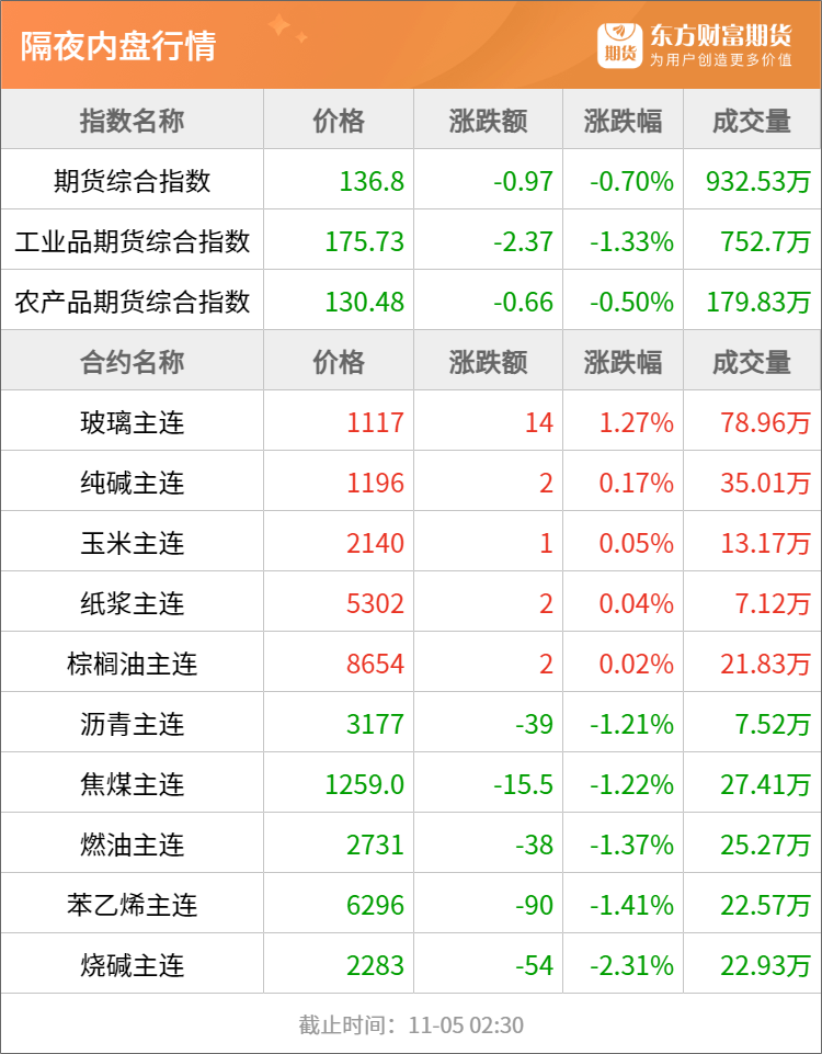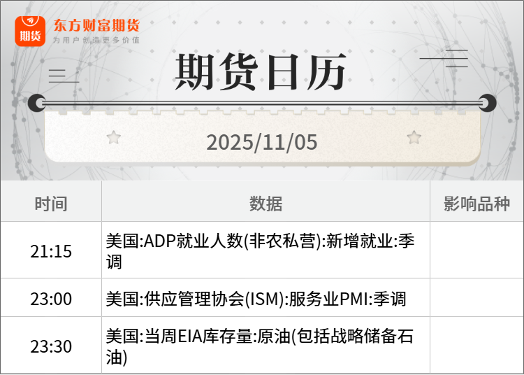 隔夜行情![]() ![]() 每日精选国办发布2026年部分节假日安排 春节假期共9天 利率罕见暴涨!美国“钱荒”出现了? 备货需求未启、菜油进口量预增 国内菜籽油价格11月或仍有下跌预期 宏观产经新华社:中共中央政治局委员、中央财办主任何立峰4日在京会见美国高盛集团董事长兼首席执行官苏德巍。何立峰表示,中美两国元首不久前在韩国釜山成功会晤,为下一步双边经贸关系发展指明了方向。双方应共同认真落实好两国元首达成的系列重要共识,这有利于两国企业稳定预期,推动中美经贸关系稳定、健康、可持续发展,也有利于全球经济的稳定发展。欢迎高盛集团继续在华投资兴业。苏德巍表示,高盛集团看好中国经济发展前景,愿继续为中国资本市场高质量发展作出贡献。 澎湃新闻:自年初暂停的公开市场国债买卖操作在10月已经恢复。11月4日,中国人民银行公布的2025年10月中央银行各项工具流动性投放情况显示,10月通过公开市场国债买卖投放200亿元,净投放规模为200亿元。 澎湃新闻:中国人民银行11月4日发布公开市场买断式逆回购招标公告称,为保持银行体系流动性充裕,2025年11月5日,将以固定数量、利率招标、多重价位中标方式开展7000亿元买断式逆回购操作,期限为3个月(91天)。 品种资讯黑色系期货 螺纹钢:据Mysteel调研,10月份全国建筑钢材生产企业共计33家企业进行了减产检修,影响建筑钢材产量176.2万吨,环比减少2.12%,其中影响螺纹钢产量131.08万吨。(我的钢铁网) 焦煤:大连商品交易所4日发布公告称,拟修改《大连商品交易所焦煤期货合约》和《大连商品交易所焦煤期货业务细则》,对焦煤交割质量标准进行调整,并向社会公开征求意见。(大商所) 铁矿石:卫星数据显示,2025年10月27日-11月2日期间,澳大利亚、巴西七个主要港口铁矿石库存总量1216.8万吨,环比上升58.5万吨,呈小幅累库态势,但当前库存水平仍低于下半年均值。(我的钢铁网) 农产品期货 白糖:巴西农业部下属的国家商品供应公司CONAB表示,2025/26榨季巴西糖产量预计为4502万吨,今年8月份调查预计为4450万吨。2025/26榨季巴西甘蔗产量预计为6.6645亿吨,今年8月份调查预计为6.688亿吨。(新华财经) 大豆:在中美贸易关系出现缓和迹象的背景下,全球大豆市场情绪趋稳,但在南美大豆升贴水报价回落的带动下,巴西大豆价格已低于美国同类产品,这促使中国进口商近日加快采购巴西大豆提前锁定货源。(新华财经) 棕榈油:上周豆棕价差持续修复吸引终端集中采买,棕榈油成交放量,进而导致库存止增转降。监测数据显示,截止到2025年第44周末,国内棕榈油库存总量为55.5万吨,较上周的56.5万吨减少1.0万吨;合同量为4.5万吨,较上周的3.7万吨增加0.8万吨。(中国粮油商务网) 菜油:受限于国内进口油菜籽的低库存与油厂极低的开机率,国内菜油供应端压力较小,市场主要消耗现有库存,上周库存连续第九周下降。监测数据显示,截止到2025年第44周末,国内进口压榨菜油库存量为57.3万吨,较上周的60.1万吨减少2.8万吨,环比下降4.72%;合同量为4.5万吨,较上周的3.5万吨增加1.0万吨,环比增加27.30%。(中国粮油商务网) 有色/贵金属期货 多晶硅:据SMM数据显示,受枯水期以及行业自律影响,11月国内多晶硅预期产量为12.01万吨,环比10月降幅约10.4%,全球多晶硅产量约12.58万吨。海外企业除OCI马来基地或有提产可能外,Waker和Hemlock基本保持稳定。部分头部企业暂无上调价格计划,多晶硅价格暂稳。(财联社) 有投资者问特变电工,市场信息称,公司的多晶硅产能马上将被几家头部公司联合收购,请问消息是否属实?特变电工在互动平台表示,公司多晶硅产能被收购的消息不属实。(财联社) 碳酸锂:2025年10月调研产量为8.93万吨,环比上涨6.9%。本月江西一体化大厂因外采少量原料生产,有小幅增量,外采矿厂家由于代工订单增加,开工率提升,其他自有矿企业保持稳定产出;四川地区锂盐厂维持满产状态,开工率处于高位;青海盐湖企业凭借季节性高产及新产线爬坡,供应稳中有增;回收端头部企业受锂价回暖提振,保持稳定产出。(我的钢铁网) 沪铝:2025年11月4日,为应对重污染天气,洛阳、郑州、巩义等地已先后启动重污染天气橙色预警,旨在削减污染峰值、缩短污染时长、降低污染程度。该轮联防联控措施预计造成下游铝加工端部分企业再次开启环保限产,具体减少产量将视具体管控程度确定。(上海有色网) 能化期货 硅铁、尿素:郑商所公告,根据2026年节假日安排,鉴于2026年2月不足15个交易日,现决定将硅铁、尿素品种2026年2月集中注销日期调整至该月最后一个交易日。以后出现类似情况参照本公告执行,不再另行公告。(财联社) 甲醇:经研究决定,取消联宏(山东)化学有限公司指定甲醇交割厂库资格。(郑商所) 原油:据伊拉克总理新闻办公室声明,鉴于伊拉克汽油、柴油和煤油生产已满足本国消费需求,伊拉克总理苏达尼已下令停止进口汽油、柴油和煤油。(财联社) 环球视野新华财经:英国央行预计将在周四的决议中维持利率在4.0%不变,但财政大臣里夫斯的最新讲话却增加了意外降息的可能性。LSEG数据显示,货币市场目前预计英国本周降息的概率接近35%,高于周一的30%。 财联社:当地时间周二,沙特石油巨头沙特阿美公司公布了第三季度财报。财报显示,尽管依靠着产量增加,沙特阿美的盈利超出预期,不过油价下滑依旧给该公司带来了业绩压力。不过,