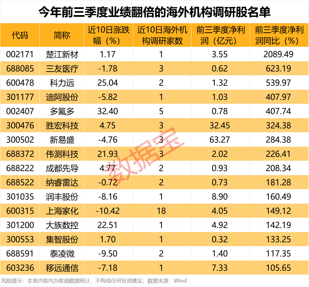 海外机构调研股名单出炉 16股业绩翻倍 炒股第一步,先开个股票账户 据证券时报·数据宝统计,按照截止日统计,近10日(10月22日至11月4日)共有747家公司获机构调研,调研机构类型显示,证券公司调研达710家,占比最多;基金公司调研635家,位列其后。 海外机构对293家上市公司进行调研,11家公司的海外机构调研家数居前,均超15家。 从前三季度业绩来看,获得海外机构调研的个股中,立讯精密的净利润规模最大,中国广核、顺丰控股、中国核电、迈瑞医疗等股的净利润规模居前。 博腾股份、楚天科技、思瑞浦、北斗星通、奥比中光等11股业绩扭亏。从业绩增长幅度来看,楚江新材、三友医疗、科力远、迪阿股份等16股的净利润同比增幅均超100%。 ![]() ![]() (文章来源:人民财讯) |