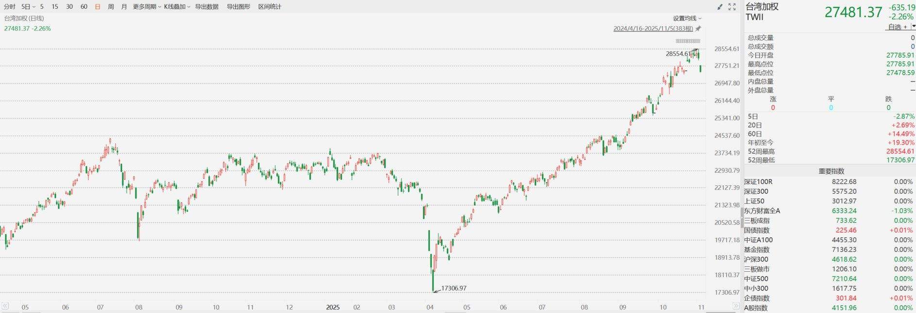 格隆汇11月5日|高盛及摩根士丹利等华尔街大行CEO警告股市可能出现调整,再加上市场对AI投资泡沫爆破担忧的加剧,在隔夜美股下跌后,今早亚太股市集体下挫。其中,年内一度累涨超70%的韩国综合指数大跌超5%,韩国综合股价指数200期货在下跌5%后,一度对KOSPI指数启用了熔断机制,程序化交易暂停5分钟;日经225指数大跌超3%;台湾加权指数跌超2%;港股恒指低开近1%,恒生科技指数低开1.75%。