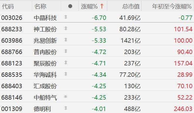 格隆汇11月5日|A股市场半导体股集体下跌,其中,中晶科技跌超6%,神工股份、兆易创新(603986)跌超5%,普冉股份、聚辰股份、华海诚科、汇成股份、中船特气、德明利跌超4%。