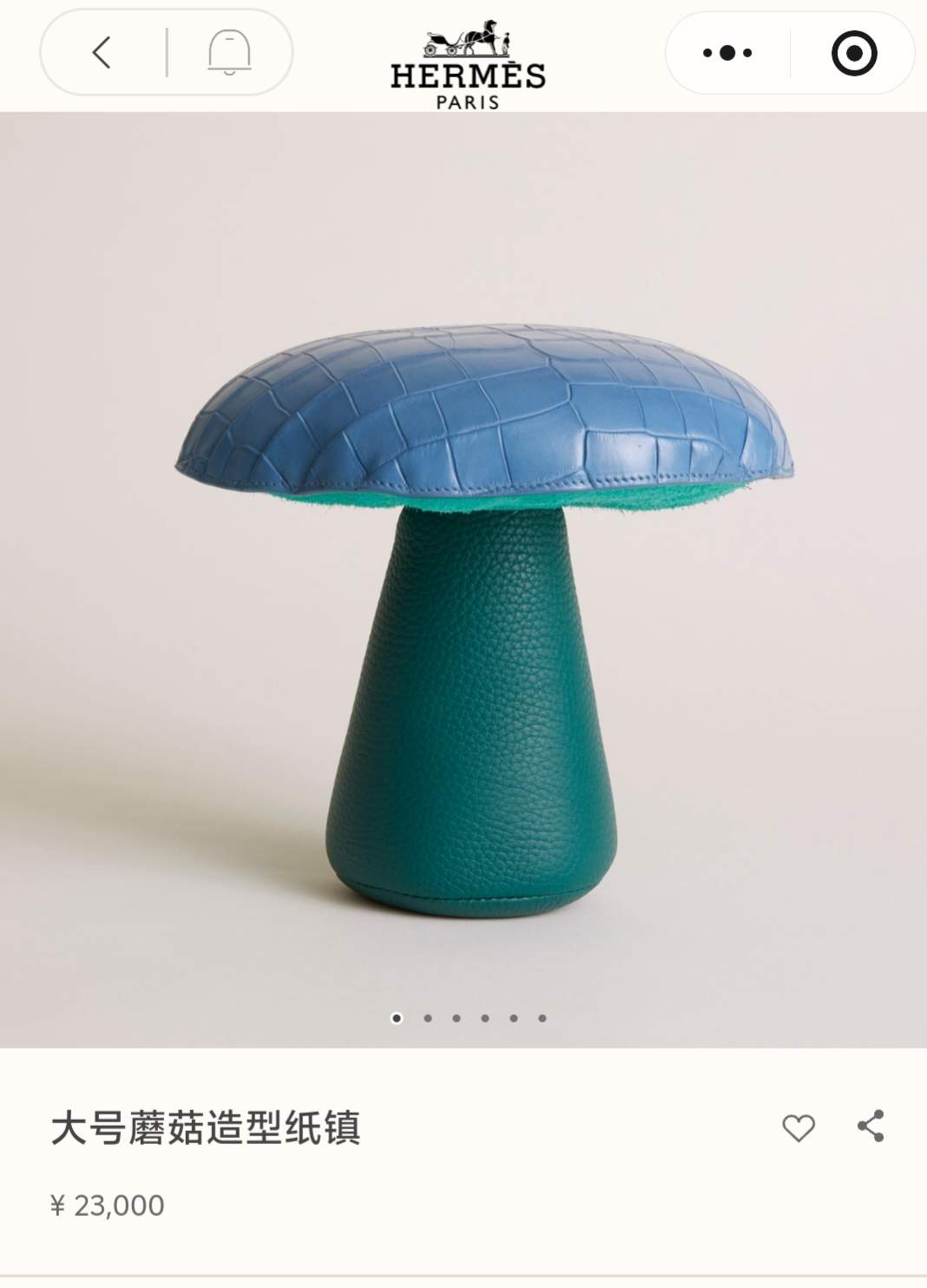 11月5日,近日,有网友发帖称,在爱马仕商品中看到一款售价23000元的大号蘑菇造型纸镇,直言“吃相不要太难看”,更有网友戏称其为“蓝瘦香菇”。