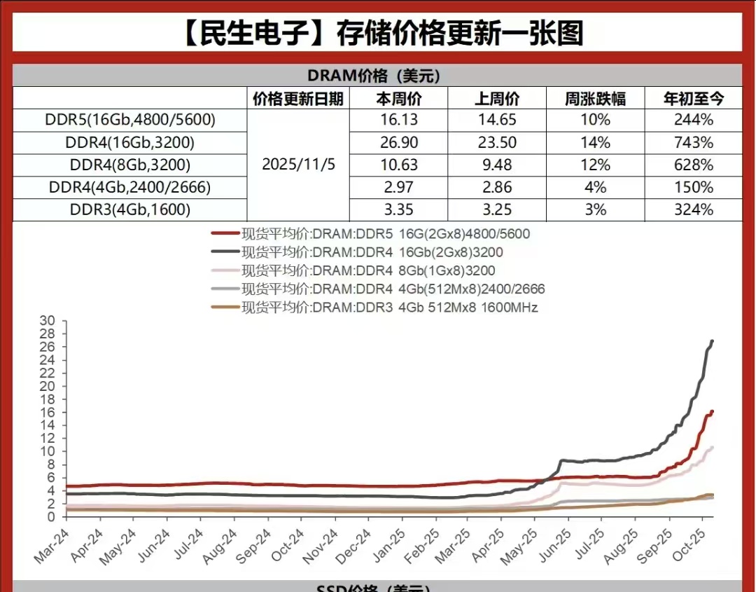 内存走出“黄金”行情,但成本飙升的压力却着实落在了手机厂商身上。 近日,多家手机厂商相关负责人发声,称上游元器件成本激增,尤其是存储的涨价波动尤其突出,甚至有厂商直呼,“看到明年成本预估,有些惊悚。” 11月5日,群智咨询(Sigmaintell)半导体分析师王旭东对第一财经记者表示,存储器件成本约占手机硬件成本的10%-20%,这一波存储涨价已经导致中高端机型普遍涨价100-500元,而部分不同内存产品的手机差价达到了3000元到4000元。 “以LPDDR4X(4GB)为例,2025年第三季度环比涨幅达到30.4%,其他DRAM产品在2025年第三季度也有不同程度的上涨,环比涨幅在20%以上。”王旭东表示,部分手机机型若不进行调价则面临亏损风险。 内存涨价潮来袭 LPDDR是手机中常用的器件,主要用于临时存储手机运行时产生的各类数据,包括系统程序、视频缓存等。从今年的终端市场定价来看,不同内存规格下的手机价差在明显加大。 社交媒体上,关于“内存比黄金还疯”的讨论热度在过去一个月居高不下,话题一度冲上微博热搜。“iPhone 17 Pro Max的2TB版本比1TB贵出整整4000块,安卓阵营这边,从256G加到512G,差价也普遍飙升到500-600元。”有消费者在电商平台查价后表示,一夜之间,“存储自由”成了奢侈品。 ![]() 王旭东对记者表示,究其原因,在本轮存储市场的价格波动中,前期价格的上扬主要源于LPDDR4X将逐步退出市场所引发的连锁反应。这一因素直接推动了存储产品价格的初步攀升,到了2025年第四季度,服务器端的需求呈现出爆发式增长态势。这一显著变化使得HBM和SSD的备货需求大幅增加,市场对这两类产品的需求热度急剧上升。 “存储厂基于利润最大化的战略考量,将生产资源与研发重心向具有更高利润空间的HBM和SSD产品转移,导致LPDDR4X/5X,以及UFS供应减少而出现价格上涨。”在王旭东看来,为了平衡成本和利润,手机厂商正在提升不同存储版本的价格,通过引导用户选择大容量存储版本来弥补存储涨价的压力。例如,红米K90标准版本12GB+512GB与12GB+256GB的价差从400元增至600元,OPPO Find X9、vivo X300等机型的12GB+256GB与16GB+512GB版本价差甚至达到900元。 对此,一些手机厂商负责人也在近期正面回应了存储涨价带来的影响。 iQOO产品副总裁罗锋表示,屏幕和存储的涨价,不但影响到新品在首发期的价格,也会影响到其全生命周期的销售和备货节奏。“这是行业共性的问题,我们确实很难去把控价格趋势。” 真我realme副总裁、中国区总裁徐起则表示,今年整个市场在成本和竞争层面都面临较大压力,由于增加了配置,因此成本也有较多上涨。“我们要保证在企业健康运营情况下提供产品,所以这一代产品比上一代定价有一定涨幅,但市场终究是以产品力优先。” “目前大幅涨价的是内存,其他零部件则呈现阶段性波动,最近其他厂商的定价在这方面都有一些压力,这是确定性趋势。”一加中国区总裁李杰称,目前采取的策略是在极限范围内定出最有诚意的价格,同时通过扩大用户规模来分摊研发与定制成本来应对。 但涨价的压力仍在加大。 据供应链消息,三星、SK海力士与美光等主要存储厂商计划在第四季度进一步上调内存价格,涨幅最高可达30%,而用于手机内存的LPDDR4X以及LPDDR5X也将继续迎来涨价。 群智咨询预测,今年第四季度,LPDDR4X价格或将继续环比上涨10%-15%,明年低容量产品价格预计继续保持全年坚挺,高容量产品则随着向LPDDR5X切换,下半年或许才会出现价格松动。 搅动终端市场 不仅仅是手机所采用的LPDDR,消费电子中,笔记本电脑所使用的DDR也在涨价,涨幅甚至达到了六到七倍。 ![]() 根据民生证券研究院整理的一份存储价格更新表,DDR4中4GB版本从年初到11月5日的涨幅为150%,而8GB和16GB版本的涨幅则高达628%和743%,近一周涨幅也普遍在10%以上。从价格看,DDR4的16GB的价格为26.90美元/颗,几乎是8GB的三倍。 “我们预计存储产品价格在2026年上半年仍将维持上涨态势。到2026年下半年,随着存储原厂产能的释放,以及终端库存水平的提升,存储产品价格的上涨势头或将得到遏制,出现价格涨幅放缓甚至价格持平的可能性。”王旭东说。 这意味着,包括手机、电脑在内的终端产品当下仍然面临着巨大的涨价压力,而持续的时间将会在一年以上,但对于价格极为敏感的消费电子市场,想要大幅涨价并不容易。 “很明显,手机厂商今年会通过配置调整,主推旗舰产品更贵的pro/max版来保证利润。当然不排除,旗舰普通版降价促销落到3000-4000档,这样将会更加挤压以前这个档位的OPPO reno,vivo s,荣耀数字和华为nova的pro版,因为这个档位的产品无法更多降价,这样就会影响走量的普通版,影响销量和利润。”IDC中国研究经理郭天翔对记者表示,成本压力让大家在技术创新上趋于保守。 一些手机厂商也因为配置问题遭到了质疑。此前有用户称,一加15从2K屏幕“减配”到1.5K,并且在影像上取消了和哈苏的合作。对此,李杰表示,2K分辨率的开启率目前在产品中仅有20%多。因此,相比于分辨率1.5K到2K的差异,一加希望将165Hz高刷新率手机的用户规模提升至700万至800万,通过大规模应用定制屏幕、散热材料和网络芯片等方式,实现成本下降,从而维持产品在价格与性能之间的平衡。 此外,也有一些手机厂商选择了更为激进的路径。过去,手机厂商realme的主战场主要在3000元以下档位,并且主攻线上渠道。但在最新的定价中,GT8系列产品价