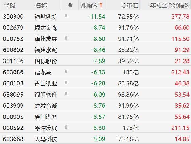 格隆汇11月6日|A股市场此前连续多日上涨的福建股今日集体回调,其中,海峡创新跌超11%,福建金森(002679)、漳州发展(000753)、福建水泥(600802)跌超8%,招标股份跌超7%,福龙马、青山纸业(600103)、福昕软件跌超6%,建发合诚、厦门港务(000905)、平潭发展(000592)、天马科技跌超5%。
