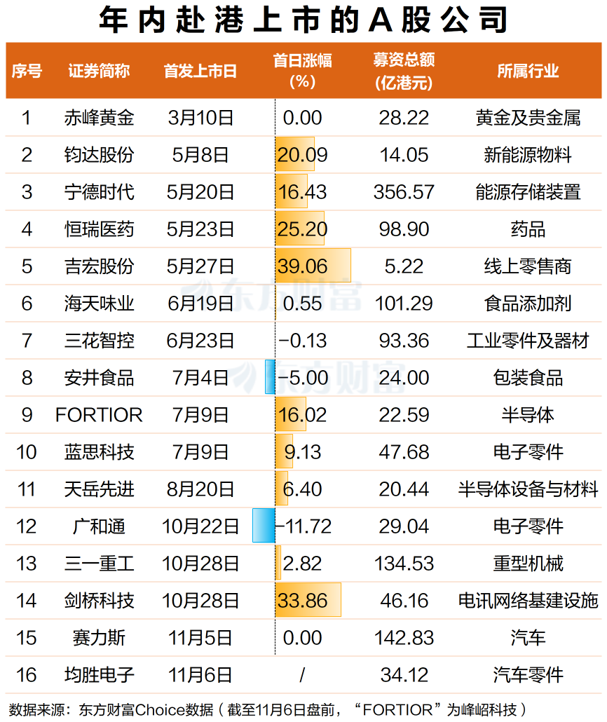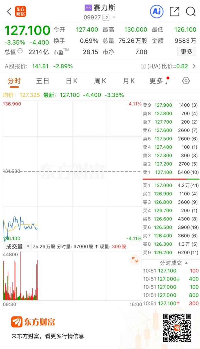 11月6日早盘,港股赛力斯低开低走,截至发稿,股价下跌3.35%。昨日,该股在香港联交所主板上市,低开后全天绿盘运行,直至尾盘快速拉升股价收平。招股书显示,赛力斯此次募资净额140.16亿港元,是年内规模最大的内地车企IPO。 ![]() 作为首家“A+H股”豪华新能源车企,市场对赛力斯的赴港上市反应热烈。自10月27日启动港股招股以来,赛力斯迅速引爆市场热情,认购热度持续高涨。赛力斯香港招股公开发售超额认购133倍,融资认购超1700亿港元。 从1986年重庆巴县起家的一家弹簧厂,到如今赴港上市,赛力斯的成长史是我国制造业转型升级的缩影。崛起的转折点源于2016年。这一年,赛力斯前瞻性地布局新能源赛道。2021年,赛力斯与华为技术有限公司跨界合作发布问界品牌,一跃成为新能源汽车市场的一匹“黑马”。 资料显示,截至目前,问界系列已形成包括问界M9、问界M8、问界M7和问界M5四款车型的产品矩阵,累计交付超过80万辆。随着问界系列产品的热销,赛力斯的规模效应与盈利潜力得以加速释放。2024年,公司净利润首次实现扭亏为盈。 最新数据显示,赛力斯前三季度实现营业收入1105.34亿元,归属于上市公司股东的净利润为53.12亿元,同比增长31.56%。今年10月份,该公司新能源汽车销量为51456辆,同比增长42.89%,创历史新高。 不过,随着港股成功上市,市场对赛力斯股价的看法有所分化。11月6日,花旗发布研报,将赛力斯A股评级由“中性”下调至“卖出”,目标价下调约22%至129.1元人民币,理由为盈利预测下调及H股上市带来的股本摊薄效应,同时判断公司黄金车型周期临近尾声。 据东方财富Choice数据,截至11月6日,有86只新股在香港联交所上市,其中“A+H”股共计16只,占比18.6%。从上市首日的股价表现看,其中9只股票首日收涨,占比过半,涨幅最大的是吉宏股份,首日涨39.06%;2股首日收平,为赤峰黄金和赛力斯。 上市首日股价收跌的“A+H”股共计3只,为三花智控、安井食品以及广和通,首日分别下跌0.13%、5.00%、11.72%。此外,11月6日上市的均胜电子,截至早间发稿下跌4.91%,有概率成为年内第4只首日破发的“A+H”股。 ![]() 业内人士表示,“A+H”上市模式火爆并非偶然。通过在港股上市,企业能够接触到国际投资者,提升品牌知名度和市场影响力。例如,美的集团和顺丰控股在2024年成功实现港股上市后,均在国际市场上获得了显著的资源配置优势。 此外,政策支持也为“A+H”上市提供了便利。2024年,香港证监会和港交所优化了上市审批流程,对于符合条件的A股企业,港交所将提供快速审批通道。这一政策的实施,使得A股企业赴港上市的效率大幅提升,进一步激发了企业的积极性。