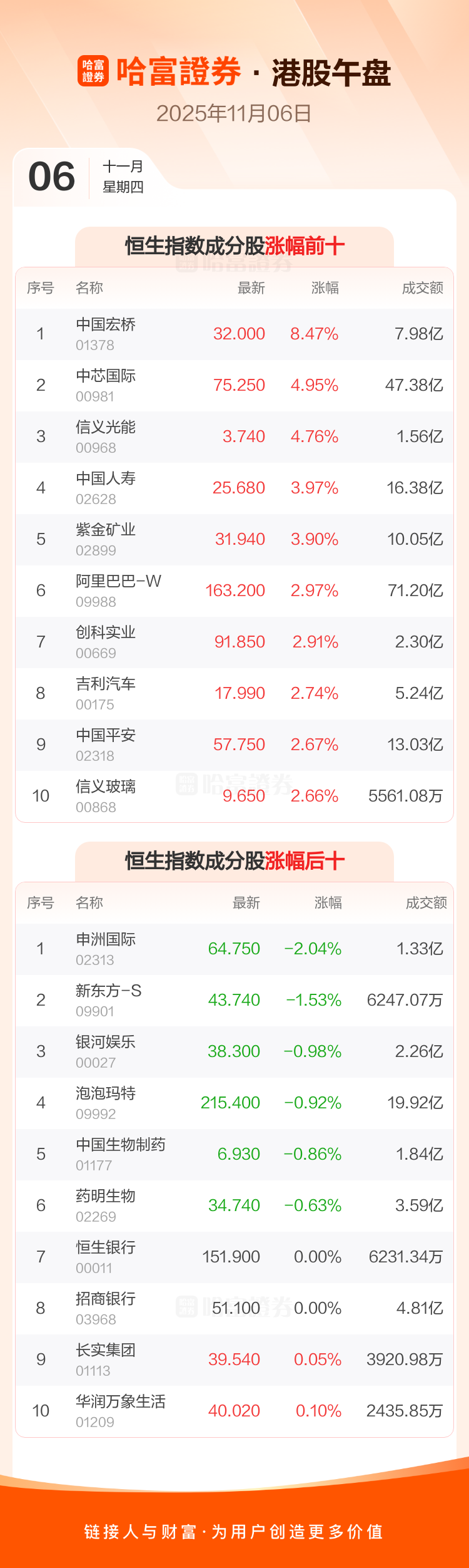 港股11月6日午盘走高,恒生指数收报26361.4点,涨425.99点,涨幅1.64%;恒生科技指数收报5903.5点,涨117.65点,涨幅2.03%。恒生指数成分股中中国宏桥、中芯国际、信义光能涨幅居前,申洲国际、新东方-S、银河娱乐跌幅靠前。恒生科技指数成分股中中芯国际、华虹半导体、阿里巴巴-W涨幅居前,ASMPT、商汤-W、腾讯音乐-SW跌幅靠前。