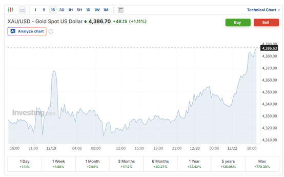 12月22日,贵金属集体大涨,多个品种创新高。截至10:00,现货黄金日内涨超1%,突