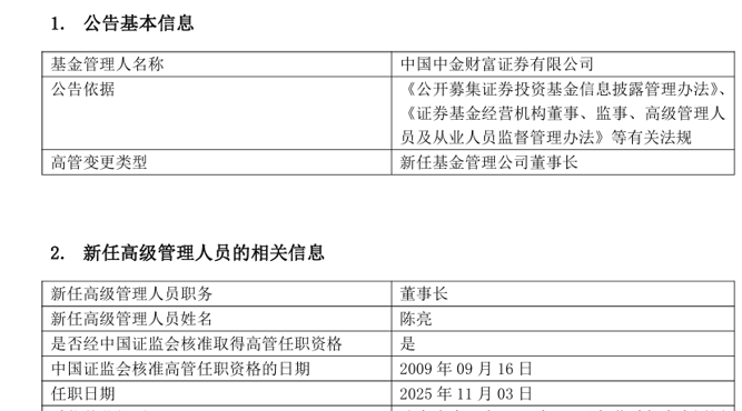 中金财富迎新董事长 在丁冬财经看资讯行情,选丁冬财经证券一站式开户交易>> 11月5日,中金财富发布公告,任命陈亮为董事长,任职日期自2025年11月3日起。 据了解,中金财富原董事长高涛今年4月到龄退休。现任中金公司董事长陈亮,此次兼任中金财富董事长职务,体现了股东方对其管理能力的认可。 陈亮是券商行业的“老兵”,曾任宏源证券股份有限公司副总经理、宏源期货有限公司董事长,申万宏源集团股份有限公司和申万宏源证券有限公司党委委员、申万宏源集团股份有限公司总经理、申万宏源西部证券有限公司执行董事、申万宏源西部证券有限公司党委书记,中国银河证券股份有限公司总裁、副董事长、董事长等职务。 陈亮自2023年11月起获委任为中金公司董事长,自2023年10月起任中金公司党委书记、管理委员会主席。 ![]() 公开信息显示,中国中金财富证券有限公司(以下简称中金财富)是中国国际金融股份有限公司的全资子公司。 根据中金公司半年报,截至2025年6月30日,中金财富总资产为1933.7亿元,净资产为202亿元;2025年上半年,实现营业收入38.21亿元,营业利润为13.02亿元,净利润为9.88万元。 经过6年深耕践行,中金财富买方投顾保有规模于今年7月站上千亿元台阶,并于近期再次突破1200亿元。中金财富买方投顾服务模式的代表性产品“中国50”自2019年发布至今,累计为客户创造收益超过101亿元。 近年来,中金财富持续深化与延展买方投顾内涵,以买方思维为牵引,积极推动交易业务向以客户为中心的模式转型,致力于为客户提供更专业、陪伴式的服务。截至目前,中金财富5大类、19项创新交易服务已累计覆盖超40万人次客户,签约资产超2200亿元。 (文章来源:中国基金报) |