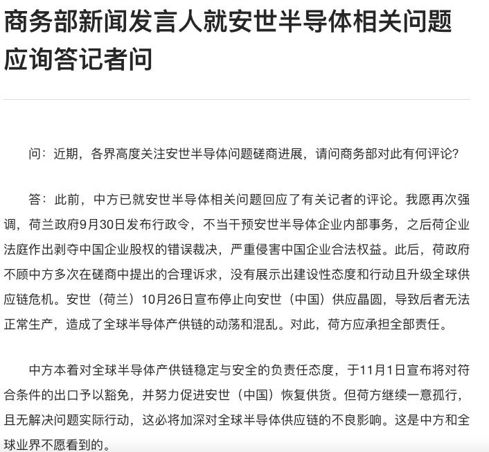 图片来源:商务部官网 11月4日,商务部新闻发言人就安世半导体相关问题应询答记者问表示,中方本着对全球半导体产供链稳定与安全的负责任态度,于11月1日宣布将对符合条件的出口予以豁免,并努力促进安世(中国)恢复供货。但荷方继续一意孤行,且无解决问题实际行动,这必将加深对全球半导体供应链的不良影响。这是中方和全球业界不愿看到的。 事实上,此次安世半导体的供应中断,正在全球汽车产业引发“连锁反应”,世界各地的车企纷纷计划缩减产量。 在10月29日开幕的2025东京车展上,日产汽车首席绩效官兼AMIEO区管理委员会主席Guillaume Cartier表示,日产的芯片供应库存能够维持到11月的第一周。“芯片供应短缺是个大问题。”Guillaume Cartier表示,日产已掌握此次争端对其主要供应商的短期影响,但尚未评估供应链下游所受影响的严重程度。