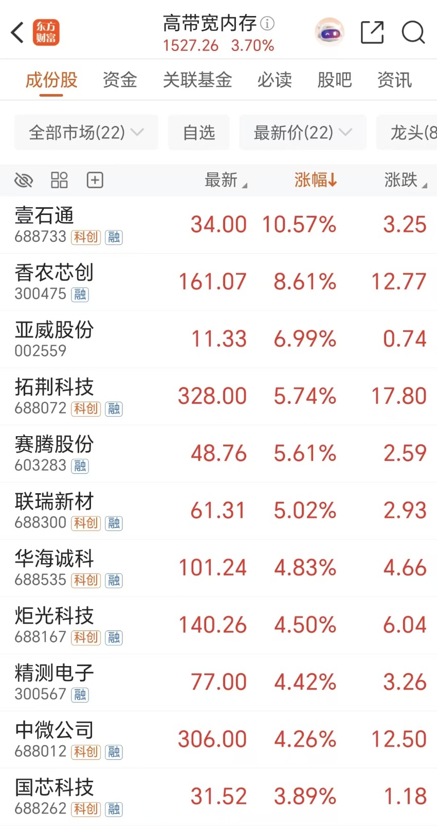 全新妙想投研助理,立即体验 周四(11月6日)存储概念股大涨,壹石通20CM涨停,德明利涨停,香农芯创涨近9%,亚威股份、拓荆科技等多股跟涨。 ![]() 先进存储涨价超预期 消息面上,11月5日,SK海力士宣布已与英伟达就明年HBM4供应完成价格和数量谈判,其向英伟达供应的HBM4单价确认约为560美元,较当前供应的HBM3E(约370美元)涨价超50%,且超出此前业内500美元的预期10%以上。 HBM4的涨价并非孤立事件,从价格端看,存储芯片呈现全面上涨态势。此前的11月3日,市场消息称,三星电子已率先暂停10月DDR5 DRAM合约报价,引发SK海力士、美光等存储原厂跟进,恢复报价预计延后至11月中旬。受此影响,短短一周内,DDR5现货价格飙升25%。 SK海力士上周披露的最新财报显示,该公司三季度的营收和利润同比暴增,创下纪录新高。SK海力士在其财报中称:“由于客户在人工智能基础设施方面的投资不断增加,整个存储领域的需求大幅增长。因此,SK海力士再次超越了上一季度的最高业绩水平,这得益于12层HBM3E和面向服务器的DDR5等高附加值产品的销量增加。” 高带宽内存(HBM)是AI应用的核心部件,随着这种内存芯片显著提升数据中心的数据处理速度,其需求也迅猛增长。 据调查机构Counterpoint Research最近发表的报告显示,在今年第二季度的全球高带宽内存(HBM)市场中,SK海力士以62%的出货量占据了首位。作为全球HBM市场的龙头,SK海力士的此次定价落地或将引爆市场对高端存储芯片的价值重估。 杠杆资金抢筹存储概念股 丁冬财经Choice数据显示,存储概念指数自9月5日企稳上行以来,杠杆资金抢筹多只存储概念股,其中香农芯创排名第一,区间融资净买入超28亿元,该股年内涨幅超340%;兆易创新排名第二,融资净买入接近19亿元,年内涨幅超47%。 协创数据、江波龙、澜起科技、长川科技、通富微电、紫光国微、雅克科技、长电科技、中微公司、德明利、佰维存储等个股融资净买额在18.5亿元至4亿元之间不等。 ![]() 而融资净买入靠前的个股在存储领域各有优势。根据机构研报,香农芯创拥有海外头部厂商代理权(如SK海力士、三星、美光),通过分销业务积累客户资源和技术支持能力,同时自研企业级SSD产品。 而德明利为存储模组厂商,业务涵盖SSD、DRAM模组、嵌入式存储等,以自研主控芯片为核心技术。 而江波龙则是全矩阵存储行业龙头,覆盖消费级与企业级市场,业务涵盖存储芯片设计、主控芯片研发、模组制造等全产业链。 机构:持续看好由存储涨价带来的周期性机遇 民生证券表示,由于三大原厂持续有限分配先进制程产能给高阶服务器DRAM和HBM,挤占一般消费级DRAM产能,整体DRAM在第四季度有望继续上涨。大同证券指出,在AI需求的强劲拉动下,预计2025年第四季度存储价格仍将延续上涨态势,持续看好由存储涨价所带来的周期性机遇。 银河证券表示,AI整体需求依然强劲,Trendforce预计2026年全球八大CSP云服务提供商资本支出将同比增长24%至5200亿美元,带动算力芯片需求,国产替代空间广阔存储芯片周期上行。国内存储厂为明年晶圆厂资本支出贡献主要增量,带动半导体设备需求。储能行业景气度上行,有望带动功率半导体需求。 中信证券表示,三大存储原厂暂停DDR5报价,DDR5现货价格飙升25%,季度涨幅或达30%—50%,存储芯片涨价叠加长鑫存储大幅扩产以及HBM3产品的交付有望进一步带动上游材料端需求持续增长,同时,在外部限制或将加码的背景下,国内将加快科技自立自强步伐,国产替代与自主可控进程或将进一步加速,拉动半导体材料增量需求,建议关注长鑫产业链,重点布局国产半导体材料细分龙头。