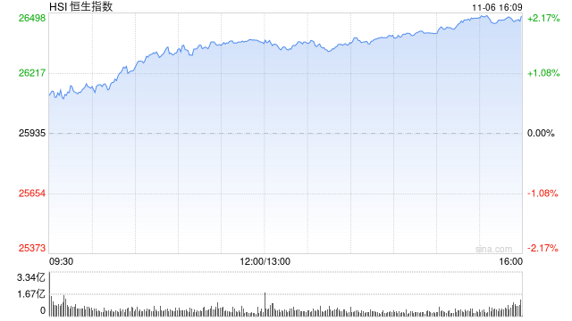 11月6日消息,港股三大指数高开高走。截至收盘,恒生指数涨2.12%,报26485.90点,恒生科技指数涨2.74%,国企指数涨2.10%。盘面上,科网股普涨,阿里巴巴涨超4%,京东涨超3%,快手、腾讯、美团涨超2%,哔哩哔哩涨2%,百度、网易涨超1%;半导体板块午后走强,华虹半导体涨超9%;有色金属板块强势,中国铝业涨超11%;苹果概念走高,蓝思科技涨超6%;今日港股4只新股上市,旺山旺水涨超145%。
