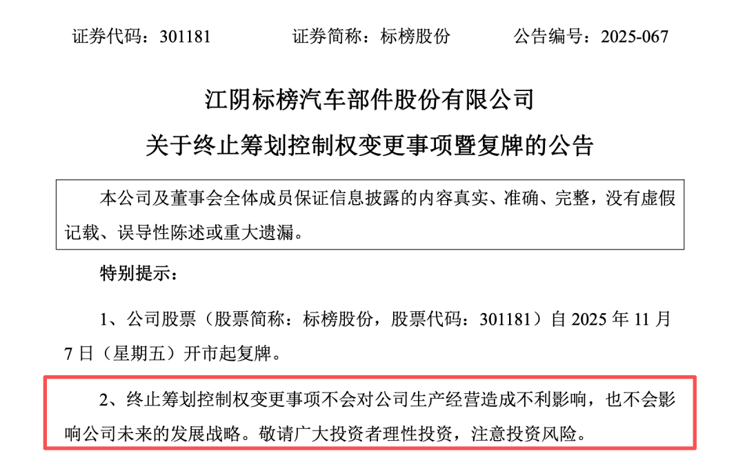 专业金融数据,下一代智能终端 10月30日宣布筹划控制权变更,11月6日宣布终止。仅一周时间,标榜股份(301181)的控制权变更事项已终止。 ![]() 标榜股份10月30日晚间公告,公司控股股东江阴标榜网络科技有限公司(以下简称“标榜网络”)、实际控制人赵奇及其他相关方正在筹划公司控制权变更相关事宜。 该事项可能导致公司控股股东、实际控制人发生变更。经公司向深交所申请,公司股票自2025年10月31日(星期五)开市起停牌,预计停牌时间不超过2个交易日。 标榜股份当时提到,各方尚未签署正式协议,正就具体交易方案、协议等相关事项进行论证和磋商,具体情况以各方签订的正式协议为准。 11月3日,标榜股份再次公告,截至公告披露日,相关各方正在积极推进交易的各项工作,整体方案仍在协商,交易各方尚未签署正式协议,公司预计无法在2025年11月4日开市起复牌。 标榜股份遂申请继续停牌,预计停牌不超过3个交易日。 11月6日晚,标榜股份在公告中表示,公司控股股东标榜网络、实际控制人赵奇及其他相关方与交易对方就某些核心条款未能达成一致意见。 “在认真听取各方意见并与交易对方协商一致后,为切实维护公司全体股东及公司利益,本着审慎的原则,决定终止本次控制权变更事项。相关交易方未就本次交易具体方案最终签署实质性协议,对终止本次交易无需承担违约责任。”标榜股份表示。 公司提到,目前各项经营情况正常,终止筹划控制权变更事项不会对公司经营业绩和财务状况产生重大不利影响,公司将继续围绕公司发展战略,坚持可持续发展,提升公司盈利能力。 从筹划控制权变更事项至终止控制权变更,只过去了一周时间,其间标榜股份未曾交易。停牌前,标榜股份市值约59亿元。 ![]() 截至今年三季度末,标榜股份股东约1.04万户。 标榜股份主要从事汽车尼龙管路及连接件等系列产品的研发、生产和销售,主要产品包括动力系统连接管路、冷却系统连接管路、连接件等,系国内少数进入合资品牌整车厂供应体系的汽车尼龙管路优势企业之一。 (文章来源:证券时报网) |