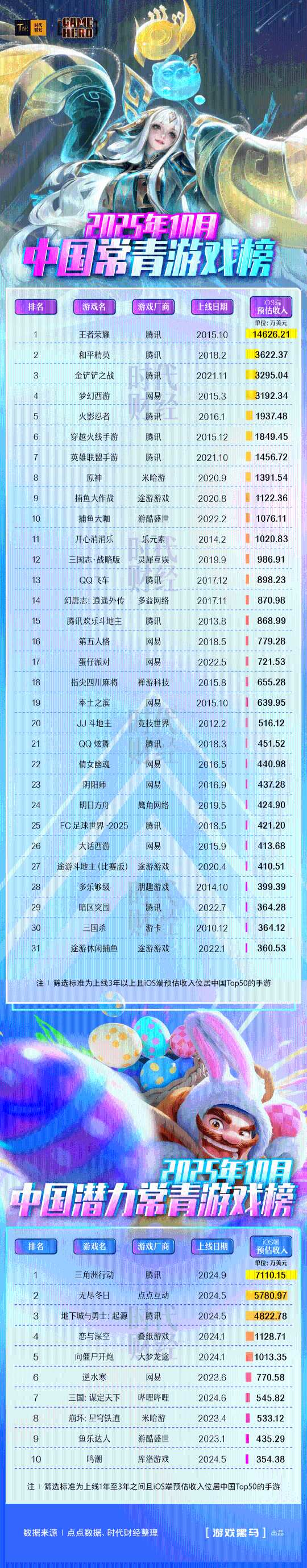 据时代财经统计,上榜《常青榜》的31款游戏2025年10月iOS端预估收入累计约达4.6亿美元,以中国外汇交易中心11月5日11:40披露的人民币兑美元成交价7.1286计算,约合人民币32.8亿元;其中11款游戏iOS端预估收入超过1000万美元(约为7128.6万元)。 具体来看,腾讯(00700.HK)、网易(NTES;09999.HK)两大游戏厂商在《常青榜》中仍然保持着突出的领先位置,分别有11款、7款游戏上榜,分别占比入围总数的35.48%、22.58%,合计接近60%。 其中,腾讯旗下《王者荣耀》《和平精英》《金铲铲之战》3款热门手游位列前三,10月中国地区iOS端预估收入分别达到1.46亿美元(约为10.43亿元)、3622.37万美元(约为2.58亿元)、3295.04万美元(约为2.35亿元)。 而作为网易旗下的王牌手游,《梦幻西游》本期排名下滑一位,位居第四位,10月中国地区iOS端预估收入为3192.34万美元(约为2.28亿元)。其后,腾讯旗下的《火影忍者》《穿越火线手游》《英雄联盟手游》3款手游位居第五至第七位,10月中国地区iOS端预估收入分别为1937.48万美元(约为1.38亿元)、1849.45万美元(约为1.32亿元)、1456.72万美元(约为1.04亿元)。 互联网产业分析师张书乐对时代财经表示,强者越强是包括游戏产业在内的互联网科技领域的大势所趋。随着技术不断迭代,游戏作为一个文创产品,对技术、资金的路径依赖也变得越来越大,尽管偶有中小厂商以黑马姿态出现,但未必能保证游戏常青,亦未必有足够资金持续输出爆款。 “但中小厂商未必一定要去比拼技术,反而可以用像素级产品和独有的经营类游戏去细分深耕创意,实现精品游戏的稳定输出,达成原始积累。”张书乐补充道。 此外,米哈游的《原神》、途游游戏的《捕鱼大作战》以及游酷盛世的《捕鱼大咖》3款手游也进入了《常青榜》前十。相比之下,一直稳居前十的网易《第五人格》本次表现不佳,跌出前十,仅位列第16位;而网易的《率土之滨》则重回前20名,这是自今年6月以来再次进入该榜单前二十。 另一方面,据时代财经梳理,与常青游戏数量减少不同的是,潜力常青游戏数量今年10月继续保持10款。这10款游戏中国地区iOS端预估收入累计达到2.25亿美元(约为16.04亿元),其中5款游戏iOS端预估收入超过1000万美元。 具体来看,位居《潜力常青榜》前三的游戏为《三角洲行动》《无尽冬日》《地下城与勇士:起源》,10月中国地区iOS端预估收入分别为7110.15万美元(约为5.07亿元)、5780.97万美元(约为4.12亿元)、4822.78万美元(约为3.44亿元)。 上述三款手游上线均不足两年,预估收入已超越众多老牌常青产品,具备进一步冲击《常青榜》的潜力。 《三角洲行动》和《无尽冬日》各占一个品类的首发优势,并实现了快速登顶。张书乐告诉时代财经,在游戏品类中,能快速登顶的垂类新玩法,往往具有经久不衰的魅力,总会被模仿,但总难以超越,其常青的可能性极大。 (责任编辑:王治强 HF013)