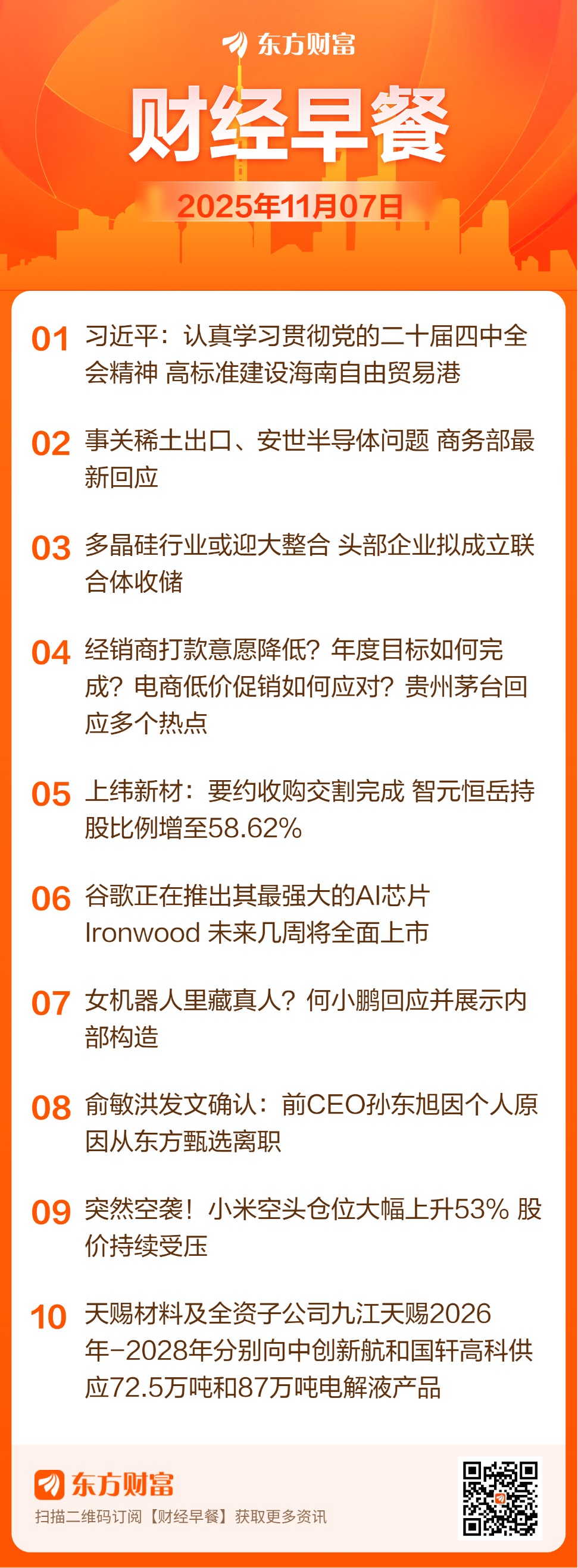 公司新闻上纬新材:公司于2025年9月25日披露的要约收购报告书已完成交割。智元恒岳已完成清算过户手续,现持有上纬新材2.36亿股股份,占总股本的58.6232%,智元恒岳及其一致行动人共计持有2.57亿股股份,占总股本的63.6232%。董事会换届选举后,公司将在不存在与关联方构成重大不利影响的实质同业竞争的前提下,在不存在严重影响独立性或者显失公平的关联交易的前提下,与关联方各自独立开展业务,发展具身智能机器人业务,公司在人员、资产、业务、机构、财务等方面均保持独立。截至目前,未来36个月内,智元创新不存在通过上市公司借壳上市的计划或安排。 天赐材料:公司全资子公司九江天赐与国轩高科签订《年度采购合同》,国轩高科2026-2028年度向九江天赐采购预计总量为87万吨的电解液产品。此外公司与中创新航签订了《2026-2028年保供框架协议》,公司承诺2026-2028年度向中创新航供应预计总量为72.5万吨的电解液产品。 小米:高盛报告称,其机构经纪主要客户对小米股票的空头仓位在过去一周内上升了53%。过去两周机构交易明显偏向纯卖出方向,且主要沽压来自养老基金与对冲基金。 东方甄选:11月6日下午,新东方创始人俞敏洪在抖音平台发布说明称,近期,东方甄选前CEO孙东旭因为个人原因,提出不再继续工作。最终,俞敏洪同意他离开,不再参与公司工作。 江波龙:公司在企业级存储领域积极布局,产品覆盖范围扩大,并在数据中心应用领域的高性能存储产品上取得进展。截至三季度末,公司自研主控芯片累计部署量突破1亿颗,并且部署规模仍在保持快速增长。 力星股份:公司与浙江荣泰于2025年11月6日签署了《战略合作协议》,双方拟在产业机器人用丝杆部件等重要领域的滚动体应用开展战略合作,打造双赢、可持续发展的战略合作伙伴关系。 浙富控股:2018年8月,公司控股子公司四川华都核设备制造有限公司与中科院上海应物所签订了关于“2MWt液态燃料钍基熔盐实验堆(TMSR-LF1)”控制棒系统采购合同,目前工程供货已全面完成。据悉,控制棒系统运行正常稳定。 华虹半导体:第三季度销售收入创历史新高,达6.352亿美元,同比增长20.7%,环比增长12.2%;母公司拥有人应占利润2570万美元,同比下降42.6%,环比上升223.5%。预计第四季度销售收入约在6.5亿美元至6.6亿美元之间;预计毛利率约在12%至14%之间。 星网宇达:经查询军采网,公司已经从禁止采购名单中移除,恢复参加军队物资采购活动资格。此前,公司在参加军队采购活动中存在违规行为,被禁止参加全军物资工程服务采购活动1年。 苏大维格:公司拟以自有或自筹资金5.1亿元收购常州维普半导体设备有限公司51%股权。常州维普是国内极少数在半导体光掩模缺陷检测设备领域已实现规模化量产的企业,主要核心零部件实现了国产化和自主可控。 百济神州:公司更新了预计的中国企业会计准则下2025年全年的经营业绩情况,调整前2025年度营业收入预测将介于人民币358亿元至381亿元之间,调整后预计2025年营业收入为362亿元至381亿元。 标榜股份:由于公司控股股东标榜网络、实际控制人赵奇与交易对方就核心条款未能达成一致,决定终止筹划控制权变更事项。该事项不会对公司经营业绩和财务状况产生重大不利影响。公司股票将于2025年11月7日上午开市起复牌。 悦心健康:公司与金矢机器人也共同成立了合资公司,共同研发康养领域的机器人,不仅适用于养老机构,同时也开拓满足居家需求的小型化康复设备。 >">点击查看更多上市公司重大公告>> 环球市场![]() 特朗普官宣减肥药降价协议:北京时间周五凌晨,美国总统特朗普与礼来、诺和诺德高管一同出席白宫新闻发布会,宣布美国政府与“减肥药双雄”达成药品控价协议,并将在被坊间称为“川普大药房”的TrumpRx药品直销渠道上架两家公司的折扣药品。按照日程,这场发布会原本定于当地时间早晨11时进行,但延误到下午1点左右才开始。 美联储官员对降息保持谨慎:芝加哥联储主席古尔斯比周四表示,由于政府停摆导致关键通胀数据缺失,他对进一步下调利率持谨慎态度。尽管古尔斯比此前一贯主张逐步降息,但他最新表示,重要物价报告的缺位令其担忧,特别是在总体通胀近期呈现回升态势的背景下。他声称:“如果通胀方面出现问题,我们需要相当长一段时间才能察觉;而如果劳动力市场恶化,我们几乎可以立刻看到变化。” 科技公司疯狂抢电:在周四的电话会议上,英国国家电网首席执行官约翰·佩蒂格鲁表示,电网正面临连接申请激增的状况,数据中心占到新需求的一半以上。按照目前的规划,该公司计划在5年内接入19吉瓦的新设施,相当于目前英国用电峰值需求的约三分之一。英国电力监管透露,自2024年11月以来,需求队列里的签约报装量激增。截至今年6月的可用数据,接入电网的需求从41吉瓦暴增至125吉瓦,其中输电需求暴增80吉瓦。需求总量已经达到目前英国用电峰值的两倍多。 交易提示![]() 点击立即参与申购>> 债市纵览Shibor:11月6日,隔夜shibor报1.3130%,下跌0.20个基点;7天shibor报1.4210%,下跌0.20个基点;14天shibor报1.4540%,下跌0.70个基点;1月shibor报1.5340%,下跌0.75个基点;3月shibor报1.5875%,下跌0.15个基点。 欧债:欧市尾盘,英国10年期国债收益率下跌2.9个基点,报4.433%。德国10年期国债收益率下跌2.4个基点,刷新日低至2.649%。法国10年期国债收益率跌1.2个基点,意大