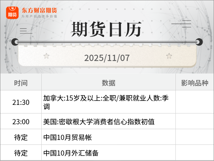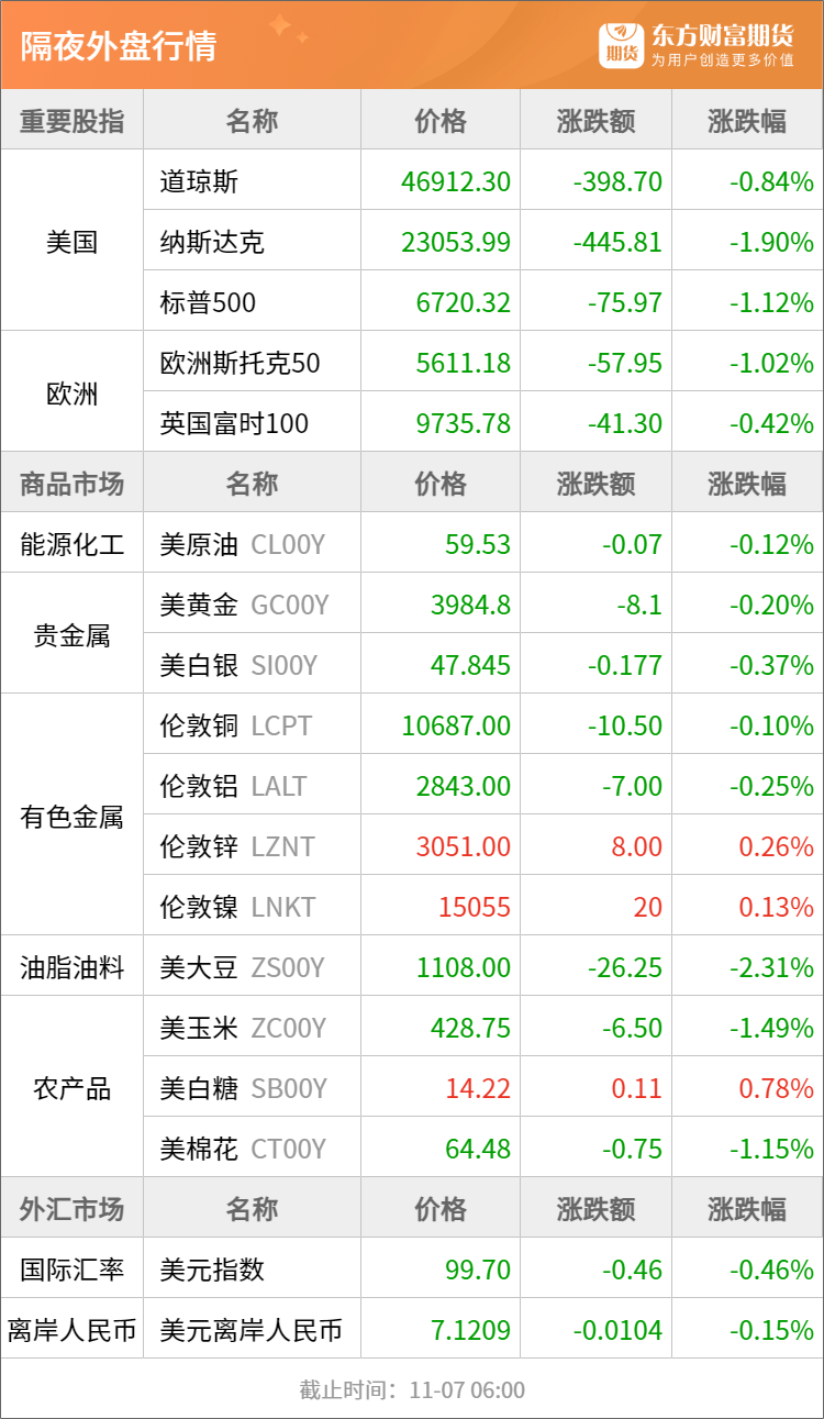 隔夜行情![]() ![]() 每日精选金价尚未见顶!专家详解历史三大牛市行情并授判断之法 多晶硅“收储”筹划半年未见具体方案 硅料价格底部反弹引入新变数 生猪产业又陷深度调整 产业大会呼吁控产能、强自律 宏观产经新华社:中共中央总书记、国家主席、中央军委主席习近平在听取海南自由贸易港建设工作汇报时强调,建设海南自由贸易港,是党中央着眼新时代全面深化改革开放作出的重大决策。要认真学习贯彻党的二十届四中全会精神,在党中央集中统一领导下,各级各有关方面密切协作、主动作为,通过持续努力,全面实现海南自由贸易港建设目标。 商务部网站:11月5日,在第八届中国国际进口博览会期间,商务部副部长兼国际贸易谈判副代表凌激在上海主持召开外资企业圆桌会,阿法拉伐、安赛乐米塔尔、默克、英特尔、空气化工、日产汽车、乐高、英中贸协等30余家外资企业及在华外国商协会代表参会。国务院研究室、国家税务总局、国家移民管理局有关司局负责人进行政策解读并回应外资企业反映的问题诉求。 界面新闻:11月6日,商务部召开例行新闻发布会。有记者提问,近期亚太经合组织领导人会议重申通过亚太自贸区推动区域经济一体化的目标。《全面与进步跨太平洋伙伴关系协定》(CPTPP)是实现亚太自贸区的路径之一。我们注意到,中方正在推进加入CPTPP进程,请问中方加入将对协定和全球带来怎样的影响?商务部新闻发言人何亚东回应称,中国政府高度重视、积极推进加入CPTPP相关工作。在单边主义、保护主义严重冲击国际经贸秩序背景下,若中国加入CPTPP,将对维护多边主义和自由贸易发挥更大作用。 品种资讯黑色系期货 螺纹钢:截至11月6日当周,螺纹钢产量、表需由增转降,厂库、社库连续四周下降。①螺纹产量208.54万吨,较上周减少4.05万吨,降幅1.91%;②螺纹厂库166.84万吨,较上周减少4.87万吨,降幅2.84%;③螺纹社库425.70万吨,较上周减少5.11万吨,降幅1.19%;④螺纹表需218.52万吨,较上周减少13.66万吨,降幅5.88%。(我的钢铁网) 焦煤:本周,523家炼焦煤矿山样本核定产能利用率为83.8%,环比减1.0%。原煤日均产量186.3万吨,环比减4.0万吨,原煤库存419.2万吨,环比减12.4万吨,精煤日均产量73.8万吨,环比减2.0万吨,精煤库存165.6万吨,环比增1.1万吨。(我的钢铁网) 锰硅:Mysteel援引南非海关统计数据,2025年9月南非锰矿出口总量约228.8万吨,环比减少4.99%,同比增加0.11%。其中出口至中国的锰矿约165.3万吨,环比减少6.84%,同比增加9.52%。(我的钢铁网) 农产品期货 红枣:据Mysteel农产品调研数据统计本周36家样本点物理库存在9541吨,较上周增加193吨,环比增加2.06%,同比增加131.35%,样本点库存增加。(我的钢铁网) 苹果:据Mysteel农产品数据显示,截至2025年11月5日,全国主产区苹果冷库库存量为698.42万吨同比减少115.02万吨,跌幅14.14%。具体来看,山东产区库容比为41.03%,较去年同期下降13.42%,栖霞东部客商货为主的乡镇入库量整体过半,西部果农货为主的乡镇入库进度偏慢,高次、果脯货入库明显高于去年,好货、统货占比下降。(我的钢铁网) 有色/贵金属期货 沪镍:印尼暂停新镍冶炼厂许可证,限制镍锍、MHP、NPI及铁镍生产。新规要求企业提交不产受限产品声明,现有持证企业暂不受影响。此举旨在调控镍产业链,推动高附加值产品发展。(我的钢铁网) 多晶硅:财联社记者从消息人士处获悉,备受关注的多晶硅重组“联合体”平台正在筹划中,收购方案具体细节仍在商讨。据悉,目前规划预计成立700亿元左右规模的基金,经讨论后,将采用百亿资金撬动700亿的“承债式”方式收购。今年5月,多家多晶硅龙头企业筹划发起并购重组;近日有消息称,10月28日,硅料龙头企业协鑫集团董事长朱共山表示,17家龙头企业已基本同意搭建联合体,预计于2025年内完成。(财联社) 氧化铝:据SMM数据,截至本周四,全国冶金级氧化铝建成总产能11032万吨/年,运行总产能9046万吨/年,全国氧化铝周度开工率较上周下跌0.18个百分点至82.18%,国内氧化铝厂维持高位运行。(上海有色网) 沪铅:Mysteel调研国内35家原生铅冶炼企业样本(总涉及产能456.7万吨,覆盖率92.56%),2025年10月国内原生铅产量27.28万吨,环比增0.95万吨或3.61%,同比增长6.48%。预计2025年11月国内原生铅产量将增至28.47万吨。(我的钢铁网) 能化期货 燃油:新加坡企业发展局(ESG)数据显示,截至11月5日当周,新加坡燃料油库存下降29.9万桶,至2448.2万桶;中馏分油库存上涨69.4万桶,达到921.6万桶;轻馏分油库存下降55.6万桶,至四周低点1278.3万桶。(新华财经) 乙二醇:截至11月06日华东主港地区MEG库存总量56.4万吨,较上一期增加5.3万吨,详细来看,张家港21万吨,太仓14万吨,宁波8.5万吨,江阴及常州9.3万吨,上海及常熟3.6万吨。(隆众资讯) 玻璃:截止到11月6日,全国浮法玻璃样本企业总库存6313.6万重箱,环比下降265.4万重箱或-4.03%,同比增幅继续升至29.05%,折库存天数27.1天,较上期下降0.9天。(隆众资讯) 纯碱:截止到2025年11月6日,国内纯碱厂家总库存171.42万吨,较周一增加2.24万吨,涨幅1.32%。其中,轻质纯碱81.46万吨,环比增加0.84万吨,重质纯碱89.96万吨,环比增加1.40万吨。(隆众资讯) 烧碱:截至2025年11月06日,全国20万吨及以上固定液碱样本企业厂库库存41.48万吨(湿吨),环比下调6.29%,同比上调57.84%。本周全国液碱样本企业库容比24.37%,环比下调1.39%;本周西北、华中、西南库容比环比上涨,华北、华