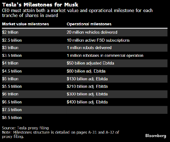 埃隆・马斯克 特斯拉表示,当天75%以上的表决结果为赞成这一提议。 这项史无前例的举措周四在特斯拉的年度股东大会上宣布,标志着董事会、这位CEO本人和知名散户为争取支持而开展的为期数周游说达到了高潮。 投票结果于周四在得克萨斯州奥斯汀举行的公司年度股东大会上公布。此次会议还包含另一项提案:允许特斯拉投资 xAI。特斯拉表示,该提案支持票多于反对票,但目前结果尚未最终确定。 这项薪酬协议也为世界首富马斯克成为史上首位万亿富翁铺平了道路,并令其在特斯拉的持股比例有望在十年内提高到25%甚至更高。要想全额拿到这笔钱,他必须实现大幅提升特斯拉市值、重振其旗舰汽车业务并让新兴的无人驾驶出租车和机器人项目顺利启动。 此次薪酬方案包含 12 批股票奖励,需特斯拉在未来十年内达成特定里程碑方可授予。方案还将提升马斯克在公司的投票权 ―― 这一安排回应了他自 2024 年初以来公开提出的诉求。届时,他在特斯拉的持股比例将从约 13% 提升至 25%,持股数量增加逾 4.23 亿股。 若特斯拉市值达到 2 万亿美元,马斯克将获得第一批股票奖励。目前特斯拉市值为 1.54 万亿美元。 接下来的 9 批股票奖励,需特斯拉市值以 5000 亿美元为增量逐步提升,直至达到 6.5 万亿美元方可依次获得。最后两批股票奖励则要求市值以 1 万亿美元为增量增长,这意味着特斯拉市值需达到 8.5 万亿美元,马斯克才能获得完整的薪酬方案。 特斯拉还为马斯克设定了一系列营收里程碑,起始目标为年度调整后利润 500 亿美元,最终目标为 4000 亿美元。今年第三季度,特斯拉公布的调整后息税折旧摊销前利润为 42 亿美元。 此次获批的薪酬方案还关联其他目标,包括:实现 2000 万辆汽车交付、1000 万份全自动驾驶有效订阅、100 万台 Optimus 人形机器人交付,以及 100 万辆自动驾驶出租车投入商业运营。根据特斯拉 9 月发布的委托声明,截至当时,公司累计交付汽车已超 800 万辆。 该方案未明确 FSD 订阅是否必须为付费订阅,或是否包含免费试用。目前特斯拉在美国提供部分自动化驾驶系统,并将其宣传为 “FSD 辅助驾驶”;公司计划对该系统进行升级,使其无需车内人员监控即可运行。 此外,薪酬方案的奖励条款中还列出一系列 “涵盖事件”,即便未达成规定的运营里程碑,若发生这些事件,马斯克仍可获得股票奖励。 “涵盖事件” 包括自然灾害、战争、流行病,以及 “国际、联邦、州和地方层面的法律、法规或其他政府行为或不作为” 发生变化,且这些变化可能阻碍公司未来的产品设计、制造或销售能力。 此次薪酬表决对特斯拉至关重要,因此前马斯克暗示若得不到对这家汽车制造商更大的控制权,他可能会卸任或将更多时间投入到自己的其它公司。