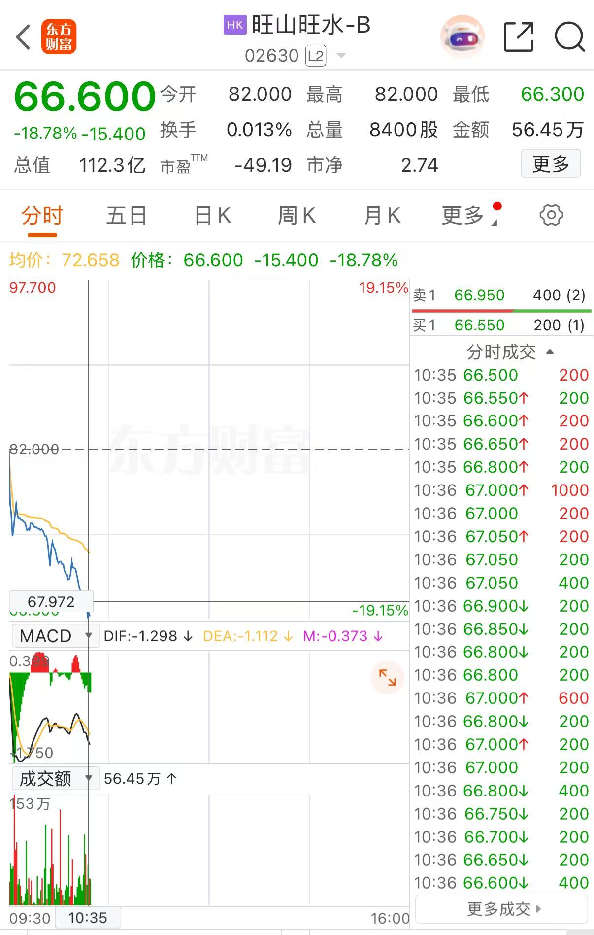 11月7日,旺山旺水开盘一度跌超19%,最低报66.3港元/股。截至10点35分,旺山旺水跌18.78%,报66.6港元/股,总市值约112.3亿港元。