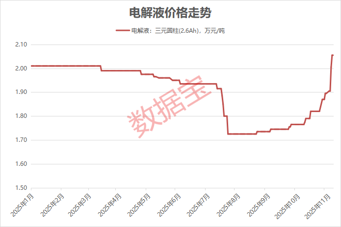 8月以来,电解液和六氟磷酸锂价格触底反弹。 11月7日早盘,A股市场主要股指走势震荡,上证指数微跌0.16%,报4001.24点,深证成指微跌0.16%,创业板指跌0.37%,北证50上涨0.93%。 板块方面,多个化工概念走强,电解液、氟化工、磷化工概念涨幅居前,此外PEEK材料、光伏玻璃、超硬材料表现较好。服务器、人工智能、金融科技等板块跌幅居前。 天赐材料签下总量近160万吨订单 11月6日晚间,天赐材料(002709)发布两则订单公告。子公司九江天赐与国轩高科签订了《年度采购合同》,协议约定,国轩高科2026—2028年度向九江天赐采购预计总量为87万吨的电解液产品。另外,公司与中创新航签订了《2026—2028年保供框架协议》,协议约定,公司承诺2026—2028年度向中创新航供应预计总量为72.5万吨的电解液产品。 公司表示,协议如果充分履行,将对公司2026至2028年度经营业绩产生积极影响,具体影响金额及时间将视协议的实施情况确定,公司将根据协议履行情况在相关年度确认收入。协议的签订有利于提升公司的持续盈利能力,有利于提升公司的市场占有率,巩固行业领先地位,符合公司的长期发展战略和全体股东的利益。 值得注意的是,天赐材料今年以来多次签约大额订单。今年7月,公司公告与楚能新能源签订协议,预计供应电解液系列产品总量不少于55万吨。今年9月,公司与瑞浦兰钧签订协议,预计供应总量不少于80万吨的电解液产品。以此计算,天赐材料今年以来签订的电解液产品订单达到294.5万吨。 受此消息影响,A股电解液概念股早盘集体走高,江苏国泰、天际股份、多氟多、石大胜华涨停,华盛锂电、海科新源涨幅超过10%,天赐材料上涨8.6%,超过30亿元主力资金净流入电解液板块。 ![]() 电解液价格上涨近20% 8月以来,电解液和六氟磷酸锂价格触底反弹,行业景气度明显回升。Wind数据显示,电解液(三元圆柱)11月7日价格为2.06万元/吨,较8月初的年内低点上涨19.08%,六氟磷酸锂11月7日价格为11.9万元/吨,较7月的4.93万元/吨涨幅达到141.38%,六氟磷酸锂作为电解液的关键原料,其价格上涨对电解液涨价起到明显的促进作用。 ![]() 下游需求旺盛对电解液涨价也起到明显的促进作用。我国新能源汽车动力电池装机保持高增长,中汽协数据显示,2025年1—9月我国新能源汽车销量达1119.60万辆,同比增长34.55%,市场占比升至46.03%,同步带动动力电池装机量高增,2025年1—9月累计装机494.10GWh,同比提升42.52%。 中原证券认为,电解液和六氟磷酸锂本轮涨价,一方面,主要由于部分六氟磷酸锂企业长期处于亏损状态,导致部分六氟磷酸锂企业因产线检修等原因供给减少;另一方面,储能与动力电池需求持续高增长带动锂电池及锂电关键材料需求持续增长,供需短期错配导致六氟磷酸锂价格快速上涨,从而带动电解液价格上涨。展望未来,短期六氟磷酸锂和电解液价格或仍将上涨。