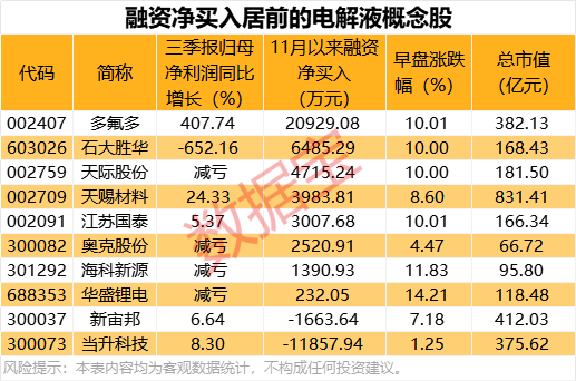 三季报业绩增长股名单出炉 据证券时报·数据宝统计,A股中布局电解液产业链的上市公司共有10家,三季报数据显示,4家减亏,5家归母净利润同比增长,总体报喜比例为九成。 多氟多三季报显示,公司前三季度实现归母净利润0.78亿元,同比增长407.74%,增幅在行业中居于首位。公司在近期调研活动中表示,公司判断10月份六氟磷酸锂市场需求持续向好,预计年底增速有所放缓,明年整体看六氟价格呈上行趋势。公司主营产品六氟磷酸锂客户以电解液厂商为主,排名前列的电解液公司均为公司客户。 从资金面上来看,11月以来,8只电解液概念股获得融资资金加仓,多氟多、石大胜华、天际股份净买入金额居前,分别为2.09亿元、6485.29万元、4715.24万元。 石大胜华最新融资余额为4.77亿元,为2024年5月以来新高,公司半年报显示,武汉基地20万吨电解液项目2025上半年产能不断爬坡提升,公司目前同时具备东营和武汉两大生产基地,多基地协同布局,可高效辐射华北、华东、华南、西南、华中等下游锂电池聚集区域,保证服务高效、便利,同时大幅降低物流费用。 ![]() (文章来源:证券时报网) |