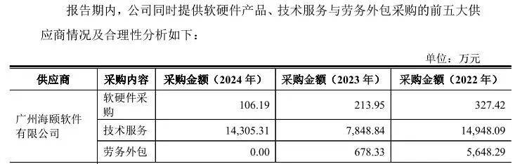 (截图来自烟台海颐2024年年报128页) 与烟台海颐年报披露的单一交易内容不同,招股书显示,南网数字向烟台海颐(包括其旗下的海颐软件)采购内容涵盖技术服务采购、软硬件采购和劳务采购,2023年、2024年合并交易金额分别为8,988.19万元、14,414.00万元。 问询回复中显示,对比交易金额,南网数字与烟台海颐的交易主要通过海颐软件开展。2022年-2024年,海颐软件始终位列技术服务供应商的前二,经计算合计金额分别为8,741.12万元、14,411.5万元,与招股书中披露的数据有所出入;同时南网数字还披露了向海颐软件采购劳务的情况,但金额逐年大幅减少,2023年,向海颐软件采购劳务外包的金额为678.33万元,2024年交易额则为0。