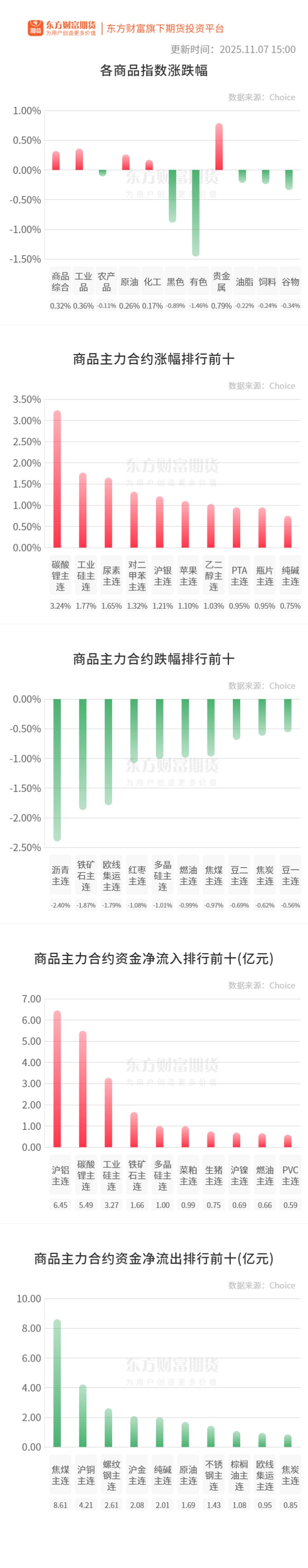 行情纵览![]() 宏观产经央视新闻客户端:海关总署今天(7日)对外公布,今年前10个月,我国货物贸易进出口平稳增长,进出口总值37.31万亿元,同比增长3.6%。其中,对共建“一带一路”国家进出口19.28万亿元,同比增长5.9%,占我国外贸总值的51.7%。民营企业进出口21.28万亿元,同比增长7.2%。10月份,我国外贸进出口3.7万亿元,其中出口、进口分别为2.17万亿、1.53万亿元。 界面新闻:荷兰政府11月7日发布声明称,荷兰经济大臣卡雷曼斯表示,欢迎中方会为安世中国工厂恢复供货提供便利的表态,“鉴于我们同中方的会谈富有建设性,相信中国供应至欧洲和世界其它地区的芯片将在未来几天送达安世客户手中”。卡雷曼斯称,荷方将继续与中方保持密切联系,并将就此事与欧盟委员会和国际伙伴密切协调。 品种资讯黑色系期货 焦炭:7日乌海市场个别焦企对捣固湿熄焦提涨50元/吨,对捣固干熄焦提涨55元/吨,自2025年11月10日零时起执行。(Mysteel) 11月7日长治市场焦炭价格计划提涨,捣固干熄焦价格上调 55 元/吨,顶装干熄焦价格上调 75 元/吨,自11月10日0时起执行。(Mysteel) 铁矿石:截至11月7日,全国44家样本生铁企业高炉产能利用率为65.78%,周环比上升0.61%,月环比上升0.51%。厂内生铁库存39.55万吨,周环比增加0.33万吨,月环比减少6.23万吨。(Mysteel) 农产品期货 棉花:截止至11月6日,进口棉主要港口库存周环比增加8.14%,总库存34.81万吨,本周库存增加明显,其中,山东地区青岛、济南港口及周边仓28.4万吨,同比减少28.28%,江苏地区张家港港口及周边仓库进口棉库存约3.48万吨,其他港口库存约2.93万吨。进口棉价格偏高,叠加配额剩余有限,本周进口棉出货较少,市场交易量有限,到港量尚可。(Mysteel) 生猪:11月7日“农产品批发价格200指数”为125.24,比昨天上升0.32个点,“菜篮子”产品批发价格指数为127.27,比昨天上升0.38个点。截至今日14:00时,全国农产品批发市场猪肉平均价格为18.23元/公斤,比昨天上升0.9%。(农业农村部) 花生:截止到2025年11月6日,国内花生油样本企业厂家花生油库存统计40320吨,较上周增加870吨,增幅2.21%。国内花生油样本企业开机率为16.21%,较上一周提高5.93%。(Mysteel) 有色/贵金属期货 沪铜:2025年10月SMM中国阳极铜企业的开工率为53.05%,环比上升3.99个百分点。区分原料来看,受到检修原因影响,矿产阳极铜企业开工率为59.13%,环比下降5.45个百分点;而因再生铜原料供应增加,精废价差扩大,废产阳极铜企业开工率环比上升8.48个百分点至50.15%。(仅指非自用阳极铜部分)(SMM) 沪铝:据市场反馈及信息核实,因铝加工材库存压力显著,南方某铝厂于11月起正式重新启动电解铝铸锭业务,铝水比例预计将由100%下降至75%,结束时间待定。同时,因铝杆市场需求疲软、地区竞争加剧,企业对铝杆生产线进行调整,铝杆日产量锐减70%;铝棒产量亦同步出现部分下调。据企业反馈,新生产的铝锭当前市场流通性较好,出货顺畅。此外,同集团另一地区铝厂亦已启动铸锭业务,具体产量规模暂未明确。(SMM) 工业硅:中国10月工业硅产量为453678吨,9月产量为412031吨,环比增加10.11%。其中新疆产量为231533吨,环比增加21.84%。四川产量为64268吨,环比下降2.87%。云南产量为51716吨,环比下降7.47%。(Mysteel) 能化期货 烧碱:今日,山东液碱市场东西部走势分化,西部市场受到供应增加,需求不佳影响,价格继续下调;东部市场整体库存压力不大,部分32碱成交价格小涨。鲁西南32%离子膜碱主流成交760-810;鲁中东部32%离子膜碱主流成交760-810,50%离子膜碱主流成交1220-1330;鲁北32%离子膜碱主流成交790-860;鲁南32%离子膜碱主流成交830-840。(单位:元/吨)(隆众资讯) 原油:中国10月原油进口4835.7万吨,9月为4725.2万吨;1-10月原油进口47100.3万吨。(海关总署) PVC:本周PVC生产企业产能利用率在80.75%环比增加2.49%,同比增加2.67%;其中电石法在81.21%环比增加3.79%,同比增加2.64%,乙烯法在79.69%环比减少0.51%,同比增加3.03%。(隆众资讯) 晚间关注无 (文章来源:丁冬财经研究中心) |