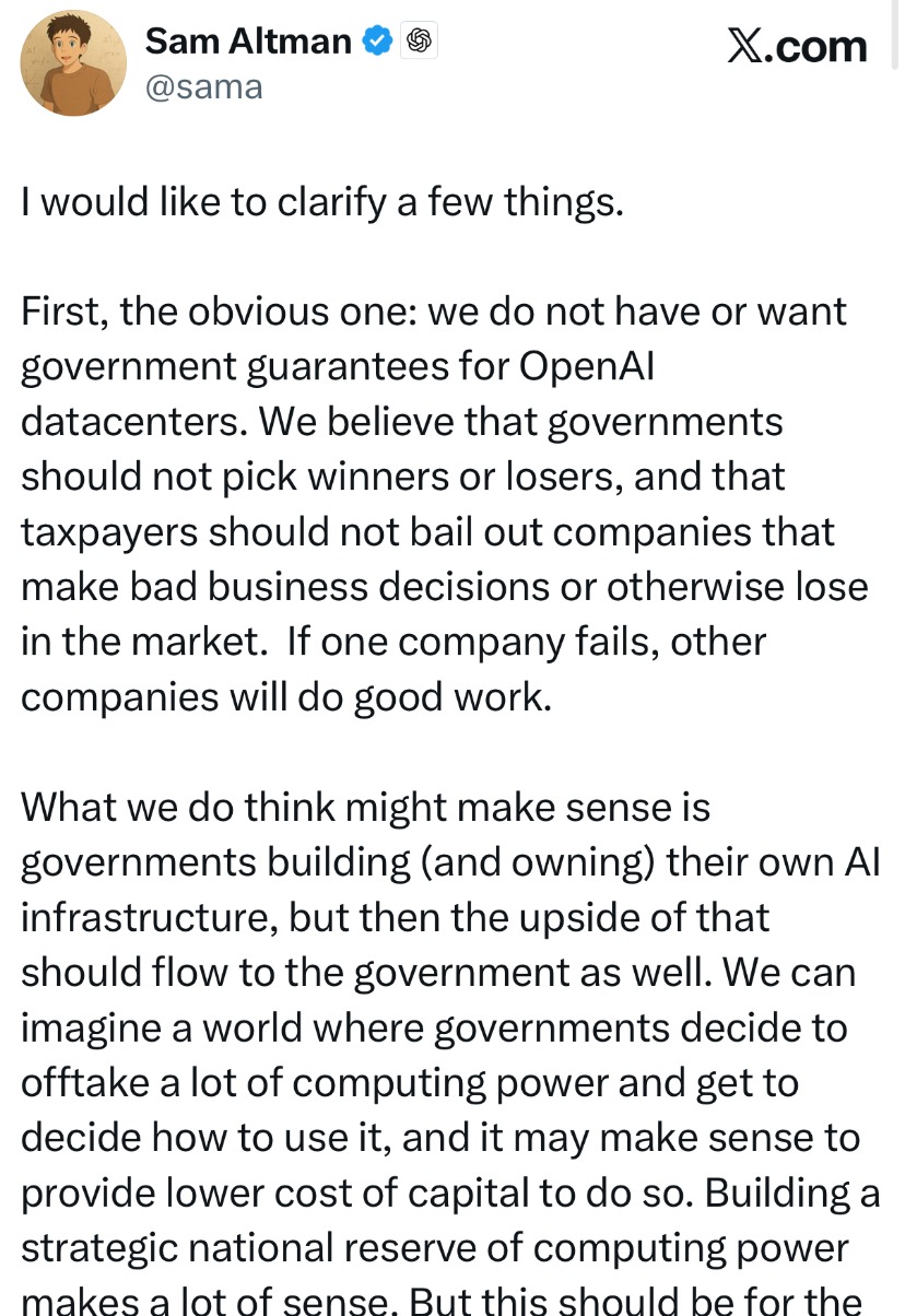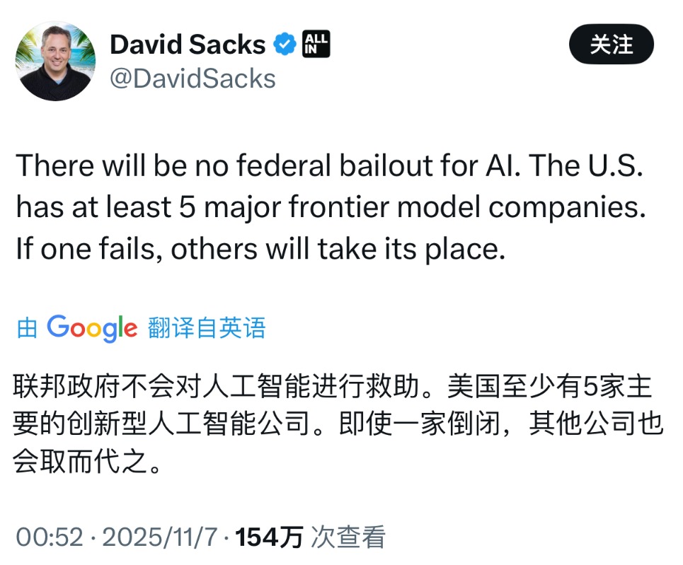 OpenAI高管一句“需要政府为AI投资担保”,在美股市场掀起巨浪。当地时间周四,美国科技股集体重挫,六大科技巨头及多家与OpenAI合作的算力厂商总市值一夜蒸发近5000亿美元。 11月7日凌晨,OpenAI CEO奥尔特曼(Sam Altman)发布近2000字长文回应,不仅澄清“不需要也不想要美国政府担保”,还首度披露公司收入预期——预计今年年化收入将超200亿美元,2030年将达数千亿美元,试图以此挽回市场信心。 ![]() 尽管美股盘后部分科技股出现小幅反弹,例如英伟达盘后上涨约0.85%,微软盘后上涨0.12%,但相比一夜蒸发的巨额市值,这样的反弹无异于杯水车薪。 美股今年一路上涨,自4月低点以来涨幅超过30%,但市场从未打消对科技圈AI泡沫的疑虑,也担忧上世纪90年代末的互联网泡沫再现,而众多华尔街机构的态度和行动也印证了这一点,这也是这次言论能引发美股巨震的根本原因。 一夜蒸发近5000亿美元 这场风暴的起点,是OpenAI首席财务官萨拉·弗里尔(Sarah Friar)在一场公开活动中的发言。她提到,公司寻求构建一个由私募基金、银行以及联邦政府“兜底”(backstop)或“担保”(guarantee)组成的生态系统,以为其巨额芯片投资提供融资支持。 市场对此反应激烈,将之解读为“AI巨头需要政府托底”,进一步加剧了本就存在的AI泡沫担忧。 此前几个月,OpenAI、英伟达和几大算力厂商达成了一系列合作,基于数据中心建设签下了1.4万亿美元的订单承诺,但OpenAI目前的营收能力远不能覆盖这一资本支出,被认为是一场豪赌,而巨头之间的“循环交易”也引发外界关于AI泡沫的质疑。 11月7日收盘,美股三大指数集体下跌,科技股成为重灾区。万得美国科技七巨头指数跌1.91%。具体来看,英伟达跌3.65%,特斯拉跌3.5%,亚马逊跌2.86%,Meta跌2.67%,领跌七巨头。另外微软已连续七个交易日下跌,昨夜跌1.98%,创2022年以来最长连跌天数,苹果微跌0.14%。七巨头中仅谷歌微涨0.21%。 ![]() 英伟达一夜跌去1730亿美元,六大科技巨头总市值一夜蒸发近4300亿美元。此外,与OpenAI展开算力合作的AI股未能幸免,AMD跌7.27%,英特尔跌2.97%,甲骨文跌2.6%,博通跌0.94%,四家算力厂商一夜蒸发超过630亿美元。 第一财经以最新收盘价计算,这些科技股总计蒸发近5000亿美元,折合人民币近3.3万亿元。 事件愈演愈烈后,美国政府的AI顾问David Sacks在社媒上回应称,美国至少有5家主要前沿AI模型公司,如果一家倒闭,其他公司将取而代之。 ![]() 弗里尔也出来回应称,使用“backstop(兜底)”一词让事情变得模糊不清,她想表达的观点是,美国在技术领域的实力将来自于建立真正的工业产能,这需要私营部门和政府各尽其责。美国政府一直非常积极主动,并且确实明白AI是一项国家战略资产。 奥尔特曼也在7日凌晨紧急发文“救火” ,这一帖子全文近2000字,其中奥尔特曼称“不需要也不想要美国政府为OpenAI数据中心提供担保”。 针对市场最关心的“如何支付1.4万亿美元基础设施订单”,他首度披露了公司的收入预期:今年年化收入将超200亿美元,到2030年将增长至数千亿美元。 “每一次收入翻番都意味着巨大挑战,但我们充满信心。”奥尔特曼透露,公司即将推出“企业级产品”,并将在消费电子和机器人领域拓展布局。 对于为何不循序渐进、而要一次性投入巨资,他解释:“我们从研究中看到的未来前景表明,现在正是加大投入、扩大技术规模的最佳时机。”他认为,OpenAI面临“算力不足的风险远大于算力过剩”。 AI泡沫隐忧 尽管这些回应带来盘后小幅反弹,但市场情绪并未真正平复。美股盘后,英伟达上涨约0.85%,AMD涨0.42%,微软涨0.12%,大部分都是小于1%的增幅。 今年以来,美股自4月低点已上涨超30%,但关于“AI是否泡沫化”的质疑始终未散,市场担忧上世纪90年代末的互联网泡沫再现。 除了OpenAI引发的风波,美国就业市场也传来不利信号。美国就业咨询公司Challenger发布的数据显示,截至今年9月,美国企业宣布的裁员人数已接近95万,创下2020年以来同期最高水平。 “巴菲特指标”同样亮起红灯——美国股市规模已超过GDP总量的2倍,高于疫情时期创下的历史纪录。巴菲特指标用于评估股票估值是否过高,虽然并不完美但仍是一个实用的参考工具。 美国知名空头迈克尔·伯里(Michael Burry)用行动表达了看跌,他在上周发文称,“有时我们能察觉泡沫的存在,有时我们能采取行动应对,有时唯一的获胜方式就是选择不参与。”据外媒消息,伯里执掌的Scion资产管理公司披露的三季度报告显示,已斥资约11亿美元做空美股AI板块的英伟达与Palantir。 “股神”巴菲特在交棒前,披露的现金储备也在向市场传递谨慎信号。11月1日,伯克希尔·哈撒韦在2025年第三季度财报中披露,截至三季度末,伯克希尔现金储备飙升至3816.7亿美元,再创历史新高。 这份财报的特殊意义在于,这是巴菲特卸任前的最后一份业绩报告。在美股估值普遍偏高的情况下,巴菲特选择了“持币观望”的防守策略。三季度伯克希尔还在继续净卖出其他公司股票,延续了该公司近期减持股票的趋势,表明巴菲特认为市场缺乏有吸引力的投资标的。 在近日的意大利科技周(Italy Tech Week)上,高盛CEO大卫·所罗门也发出警告,股市不会直线上涨,许多押注于越来越高回报的人可能会在未来一两年失望。 所罗门认为,某种技术刚刚兴起、尚未被大众普遍接受时,股票回报率往往最高,但总会有赢家和输家。他以互联网泡沫为例