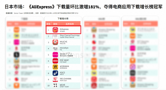 丁冬科技讯 11月7日下午消息,近日,据数据分析机构Sensor Tower 推出的《2025年购物季电商应用与品牌市场洞察》报告显示:阿里旗下的跨境电商平台速卖通AliExpress在日本应用市场下载量环比激增181%,打败KAUCHE等多个本土电商平台,拿下今年日本电商应用下载增长榜冠军。