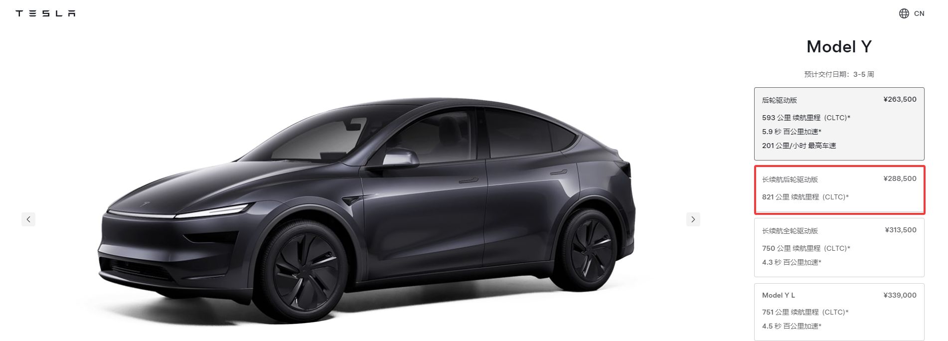 11月8日,据特斯拉中国官网显示,Model Y长续航后轮驱动版正式开售,28.85万元起售。 ![]() 图片来源:特斯拉官方微博 这款新车型配备 78.4kWh 电池,CLTC 续航 821km(19 英寸轮毂)/756 km(20 英寸轮毂),百公里加速 5.6 秒,最高时速可达 201km/h,预计交付日期 2~4 周。 至此Model Y全系已包含4款车型:后轮驱动版(26.35万元起)、长续航后轮驱动版(28.85万元起)、长续航全轮驱动版(31.35万元起)和六座版本的Model Y L。 ![]() 据公开资料,10月2日,特斯拉发布2025年第三季度全球生产与交付报告。数据显示,本季度特斯拉全球共生产纯电动车约44.7万辆;交付量达49.7万辆,同比增长7.4%,刷新了季度交付纪录,大幅高于分析师预期的44.8万辆。其中,Model 3/Y交付量为48.1万辆,同比增长9.4%。 分析师认为,特斯拉第三季度交付量远超预期,主要得益于两方面:中国市场的强劲复苏,以及在美国市场上电动汽车税收优惠取消前需求提前释放。 近期,特斯拉股价已经一路飙升,在经历了残酷的第一季度暴跌后,特斯拉已经在第三季度上涨了约40%,全年也已转为正值。 截至当地时间11月7日收盘,特斯拉报429.52美元,市值1.43万元美元。 中国市场方面,9月份,上海超级工厂交付量超过9万辆,在中国市场销量超7.1万辆,环比增长25%。其中,Model Y为SUV销冠。第三季度,特斯拉在中国市场的销量为16.92万辆,环比增长31%,创下年内新高。 在中国市场上,影响电动汽车销量的一个重要影响因素是新能源车购置税即将退坡。今年是免征新能源汽车车辆购置税的最后一年,2026年和2027年,新能源汽车将减半征收车辆购置税,每辆新能源乘用车减税额不超过1.5万元。以23.55万元起售的Model 3为例,明年就将多缴纳约1万元的购置税。 为进一步拉动销量,特斯拉在10月1日继续实行购车优惠政策:在10月31日前下单Model Y和Model 3,可享“5年0息”(Model Y L可享“3年0息”)、8000元车漆选装礼金、1299元特享充电权益,以及“智能辅助驾驶限时免费转移”等福利;Model 3指定版本车型还可以叠加享受8000元限时保险补贴。 在美国市场,高达7500美元的联邦政府补贴于9月30日到期结束,消费者也在政策结束前纷纷购买电动汽车。调研机构Motor Intelligence数据显示,今年前九个月,美国电动汽车(不包括混合动力汽车)销量在第三季度创下了新的季度纪录,销量超过43.8万辆,市场份额达10.5%。 值得注意的海思,北京时间11月7日凌晨,特斯拉召开年度股东大会,马斯克称,Roadster 2将于明年4月1日发布,并于发布后的12到18个月内开始生产。 马斯克还透露,特斯拉将不得不建造一家大型芯片工厂。我们或许会与英特尔开展合作。 据界面新闻,在上述股东大会上,马斯克还透露了特斯拉的全自动驾驶技术 (FSD)入华进展,据他表示,FSD在中国仅获得了“部分批准”。他说自己被告知 FSD 预计将在 2026年2月或3月左右在中国获得全面批准。 另据新华社报道,在部分股东弃权的情况下,特斯拉股东大会投票支持特斯拉投资马斯克旗下的人工智能公司xAI。这项投资决定虽然有利益冲突的嫌疑,但被认为有利于特斯拉和xAI两家企业的发展。