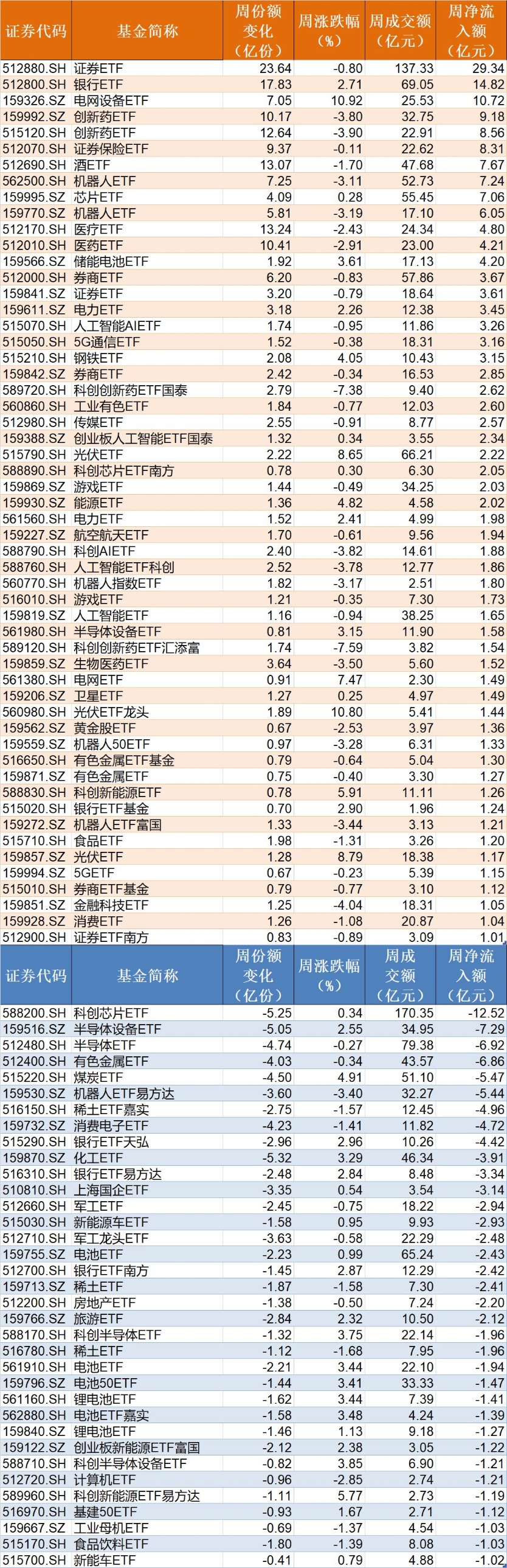 券商、电网设备等ETF受资金追捧 在行业主题ETF方面,本周净流入资金超1亿元的基金有55只,其中券商ETF、银行ETF和电网设备ETF分别增加了23.64亿份、17.83亿份和7.05亿份,净流入资金29.34亿元、14.82亿元和10.72亿元。 ![]() 在资金流出方面,本周有35只行业主题ETF净流出逾1亿元,其中科创芯片ETF、半导体设备ETF和半导体ETF份额分别减少5.25亿份、5.05亿份和4.74亿份,分别净流出资金12.52亿元、7.29亿元和6.92亿元。 值得注意的是,本周证券ETF(512880)基金份额突破500亿份,创上市新高。 ![]() 券商ETF(512880)基金份额变化 有机构分析表示,券商作为典型的“牛市风向标”,在市场情绪回暖和风格再平衡中具备天然优势。同时,沪指突破4000点心理关口,市场成交量放大,直接利好券商的经纪、自营等业务。由于券商股对市场的上涨具有高度敏感性,指数上涨往往带动券商板块走强。当前市场处于风格再平衡阶段,券商板块作为低估值、高弹性的代表,具备阶段性配置价值。 另外,电网设备ETF(159326)近期持续受到资金追捧,份额升破10亿份,创上市新高。 ![]() 电网设备ETF(159326)基金份额变化 在机构看来,电网设备出海逻辑仍然强势,其中非特高压主网板块业绩表现较好,主要系该赛道出海保持高景气,叠加网内主网建设需求持续较强。配电层面,企业出海收入及订单同样保持高速增长,同时海外市场竞争加剧。以变压器为代表的一次设备出海逻辑仍然强势,无论主网、配网,从订单及收入来看仍然呈现高速增长态势。展望后续,高电压等级电网设备的紧缺更具备持续性。 22只ETF周成交额超100亿元 本周,股票型ETF和跨境型ETF成交额超100亿元的ETF有21只。 ![]() 其中,香港证券ETF周成交额超500亿元。 另外,本周中韩半导体ETF创历史新高,A500ETF易方达成交额创历史新高。 有分析认为,在当前政策和业绩真空期环境下,短期进一步的事件驱动因素较少,市场或维持震荡走势,建议维持红利、微盘、产业趋势的均衡布局。未来需进一步关注市场成交额及科技龙头表现,若市场成交额持续放大,叠加全球AI浪潮下产业趋势明确,则科技权重或具备进一步增配空间。 7只ETF下周发行 基金重仓股向来是投资者关注的热点,但是主动管理型基金的重仓股浮出水面,通常都有一定的滞后性,而ETF布局的标的却是非常明确的,通过跟踪新上市ETF,通常可以发现近期热点个股,新上市ETF带来的增量资金也值得关注。 目前有3只ETF披露下周上市,跟踪标的为通用航空、港股通互联网、金融科技主题等。 ![]() 目前有7只ETF披露下周发行,跟踪标的有港股通汽车产业、港股通互联网、化工、生物科技、光伏、工程机械等。 ![]() 想炒股,先开户!选丁冬财经证券,行情交易一个APP搞定>> (文章来源:每日经济新闻) |