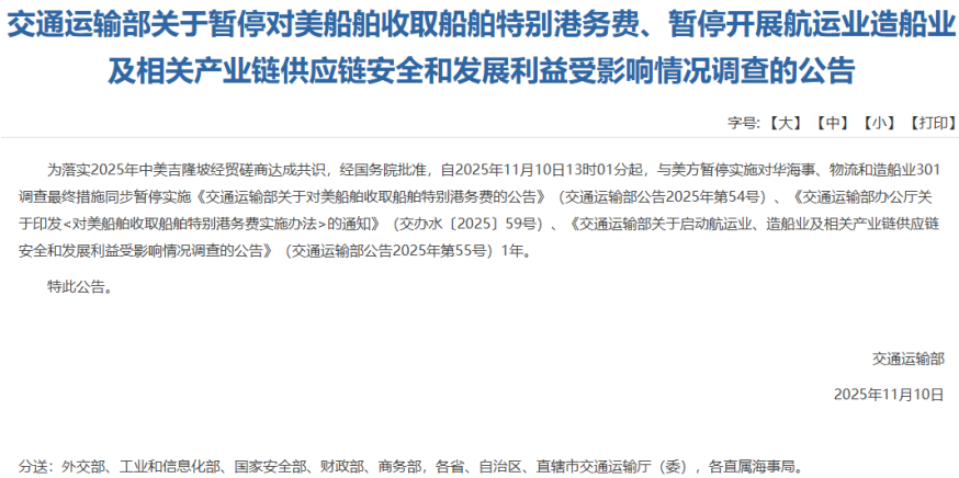 暂停实施 11月10日,交通运输部发布公告,为落实2025年中美吉隆坡经贸磋商达成共识,经国务院批准,自2025年11月10日13时01分起,与美方暂停实施对华海事、物流和造船业301调查最终措施同步暂停实施《交通运输部关于对美船舶收取船舶特别港务费的公告》(交通运输部公告2025年第54号)、《交通运输部办公厅关于印发<对美船舶收取船舶特别港务费实施办法>的通知》(交办水〔2025〕59号)、《交通运输部关于启动航运业、造船业及相关产业链供应链安全和发展利益受影响情况调查的公告》(交通运输部公告2025年第55号)1年。 ![]() 当地时间11月9日,美国贸易代表办公室(USTR)发布公告,宣布暂停针对中国海事、物流及造船业的301调查相关措施。美国贸易代表办公室表示,该行动将暂停一年,暂停期自美国东部时间2025年11月10日凌晨12时01分起生效。 此前,当地时间11月6日,美国贸易代表办公室发布公告称,自11月10日起,将暂停因“301条款”贸易调查对中国采取的所有惩罚性措施,为期一年。意见征询期截至当地时间周五(7日)下午。 在执行上述行动期间,美国贸易代表办公室表示,美国将持续推进国内改革,并与主要盟友及伙伴共商重振美国造船业之策。 另外,中国商务部昨日(11月9日)发布公告,公布调整实施商务部公告2024年第46号的决定:经批准,自即日起至2026年11月27日,商务部公告2024年第46号(《关于加强相关两用物项对美国出口管制的公告》)第二款暂停实施。 回顾此前,10月25日至26日,中美经贸团队通过吉隆坡磋商,就美对华海事、物流和造船业301措施、延长“对等关税”暂停期、芬太尼关税和执法合作、农产品贸易、出口管制等议题达成了共识成果。 全线大涨 市场层面,美股三大期指集体走高,截至北京时间11月10日13点,纳斯达克100指数期货涨幅扩大至1.2%,标普500股指期货涨幅扩大至0.68%。另外,欧洲斯托克50指数期货1.4%。德国DAX指数期货涨1.4%。 与此同时,加密货币市场亦全线大涨,比特币大涨3.93%,升至106000美元附近,以太坊大涨6.8%,涨至3600美元上方。 现货黄金涨幅扩大至1.29%,目前报4061.31美元/盎司;现货白银日内大涨超2%,现报49.245美元/盎司。 消息面上,据新华社援引美国媒体9日报道,美国国会参议院已就结束联邦政府“停摆”达成一致。 另据央视新闻报道,当地时间11月9日晚,在美国联邦政府“停摆”已40天之际,美国总统特朗普在返回白宫时对媒体表示:“看起来我们离结束‘停摆’已经很近了。” 当地时间11月9日,美国参议院多数党领袖约翰·图恩当天表示,一项关于结束政府“停摆”的潜在协议“正在逐步达成”。但约翰·图恩同时表示,该协议并不能保证达成,参议院的议员们需要时间阅读提案,且可能需要数小时才能采取具体行动。 另有分析指出,投资者对“AI泡沫”的担忧情绪有所缓解,也助推了相关风险资产集体大涨。英伟达首席执行官黄仁勋要求台积电增加晶圆供应的消息,缓解了市场对人工智能领域估值过高的担忧。 11月8日,黄仁勋出席了台积电年度运动会。他表示,鉴于人工智能需求依然强劲,他已向台积电请求增加芯片供给。台积电首席执行官魏哲家也证实,黄仁勋确实提出了增加晶圆的请求。 来自花旗集团的资深美国市场股票策略师Drew Pettit在采访中强调道,短期市场疲软/向下回调可能在投资者普遍预期之内,但支撑股票市场长期牛市的“AI基本面叙事”依然完好无损,这可能为回调期间创造重大逢低买入机遇。 瑞银也表示,AI科技巨头们权重占比愈发庞大的美股市场仍处于潜在的泡沫最早期阶段——即处于泡沫未成形阶段,远未达到堪比“2000年互联网泡沫破裂”的危险顶峰,主要因市场估值未达极端泡沫水平、科技投资占GDP比重可控,并且远未出现类似千禧年泡沫时期的极端并购案等见顶信号。 东财图解·加点干货![]() (文章来源:证券时报网) |