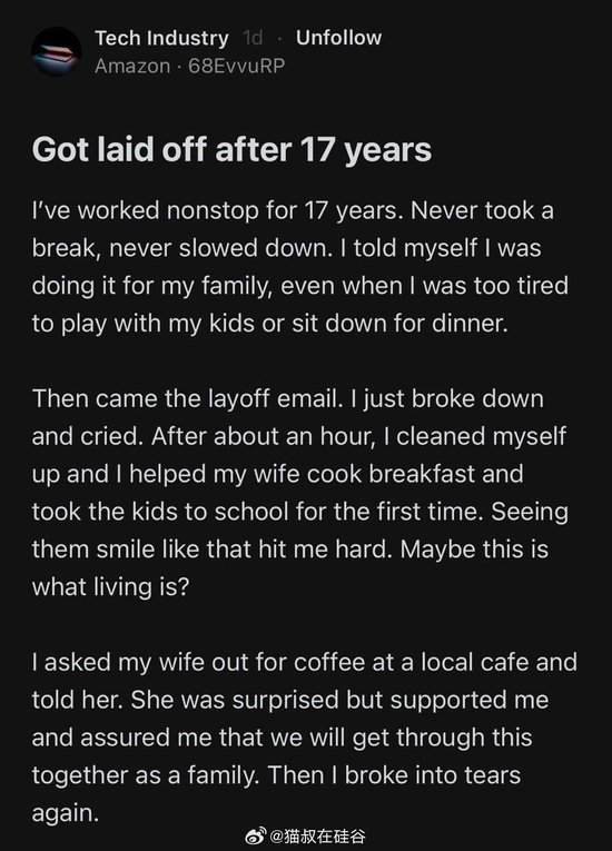 相对于其他传统行业,科技公司在裁员方面相对比较慷慨。除了极少数“铁公鸡”,大多数科技公司都会给裁员员工遣散费。但这数额差异很大:很多公司会按工作年限给予数周到数月的薪水,有的则相当吝啬,只支付法律规定的最低补偿金额。(加州劳动法规定,裁员最低补偿标准是两个月工资)。 但突然失去稳定的高薪收入来源,对很多人来说,依然是巨大的打击,尤其是那些正处在人生重大节点的人们:有的刚结婚并把配偶加入医疗保险,有的刚买下房子背上巨额房贷,有的孩子上学家人生病需要资金,还有的需要雇主担保的工作签证才能留在美国。 一位被裁工程师写道,”自己最怕的不是失业本身,而是告诉怀孕的妻子这个消息。“她刚辞职准备专心待产,我们刚买了新房,”他说,“我该怎么告诉她我们失去了唯一的收入来源?” 家庭或许是这些失业员工的最需要港湾。一位亚马逊员工在网上描述自己被裁员之后那个早晨的感受。 “自己连续工作了17年。从未休息,从未放慢脚步。我告诉自己,我是为了家人。然后裁员邮件来了。我彻底崩溃,哭了。一个小时后,我收拾好自己,帮妻子做早餐,第一次送孩子们上学。看到他们笑得那么开心,真的很震撼我。也许,这才是生活?” “我约了妻子去本地咖啡馆喝咖啡,告诉了她。她很惊讶,但支持我,说我们一家人会一起渡过难关。然后我又一次泪流满面。”