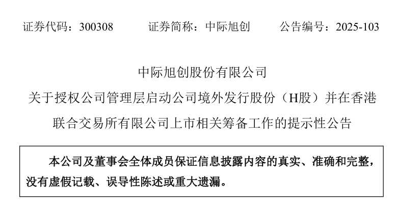 光模块巨头赴港上市 K 线图 特色数据 资金流向 公告 个股日历 核心题材 ![]() ![]() 最新价:490 涨跌额:-0.05 涨跌幅:-0.01% 成交量:35.2万手 成交额:167亿 换手率:3.19% 市盈率:57.25 总市值:5444亿 查询该股行情 实时资金流向 深度数据揭秘 进入中际旭创吧 中际旭创资金流 在丁冬财经看资讯行情,选丁冬财经证券一站式开户交易>> 超五千亿元市值的光模块巨头、“易中天”之一,中际旭创(300308)也要去港股上市了! 11月10日晚间,中际旭创公告称,公司于2025年11月10日召开董事会,审议通过相关议案,拟在境外发行股份(H股)并在香港联交所上市。 ![]() 公告显示,中际旭创董事会授权管理层启动本次H股上市的前期筹备工作,授权期限为自董事会审议通过之日起12个月内。 中际旭创表示,此举有助于持续推进公司国际化战略和全球化布局,增强公司的境外融资能力,进一步提升治理水平和核心竞争力,助力公司高质量发展,符合总体发展战略及运营的需要。 中际旭创2012年4月在创业板上市,公司主营业务为高端光通信收发模块的研发、生产及销售,产品服务于云计算数据中心、数据通信、5G无线网络、电信传输和固网接入等领域的国内外客户。 近年来,中际旭创注重技术研发,并推动产品向高速率、小型化、低功耗、低成本方向发展,为云数据中心客户提供100G、200G、400G、800G和1.6T的高速光模块,为电信设备商客户提供5G前传、中传和回传光模块,应用于城域网、骨干网和核心网传输光模块,以及固网FTTX光纤接入光器件等高端整体解决方案,在行业内保持出货量和市场份额的领先优势。 三季报显示,中际旭创2025年第三季度营业收入为102.16亿元,同比增长56.83%;净利润为31.37亿元,同比增长124.98%。2025年前三季度,公司营业收入为250.05亿元,同比增长44.43%;净利润为71.32亿元,同比增长90.05%。 中际旭创表示,公司前三季度营业收入增长主要原因是算力基础设施建设和相关资本开支的增长,带来800G等高端光模块销售的增加。 截至11月10日收盘,中际旭创股价报490元/股,总市值为5444亿元。 ![]() (文章来源:上海证券报) |