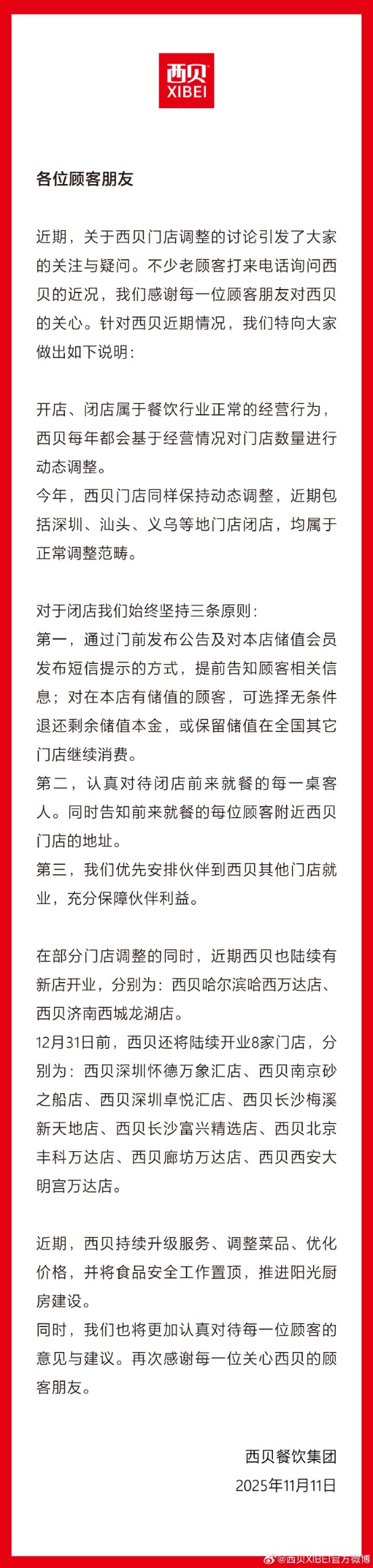 11月11日,西贝发布声明,回应关于门店调整相关讨论。西贝表示,开店、闭店属于餐饮行业正常的经营行为。西贝每年都会基于经营情况对门店数量进行动态调整。今年,西贝门店同样保持动态调整,近期包括深圳、汕头、义乌等地门店团店,均属于正常调整范畴。