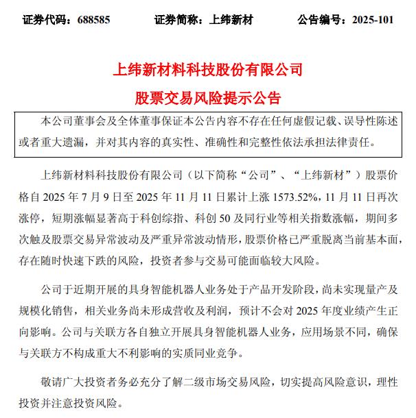 炒股第一步,先开个股票账户 上纬新材11月11日公告,公司主营业务仍为环保高性能耐腐蚀材料、风电叶片用材料、新型复合材料以及循环经济材料的研发、生产及销售,未发生重大变化。公司生产经营未发生重大变化,市场环境或行业政策未发生重大调整,生产成本和销售等情况未出现重大变化。 公司于近期开展的具身智能机器人业务处于产品开发阶段,尚未实现量产及规模化销售,相关业务尚未形成营收及利润,预计不会对2025年度业绩产生正向影响。 目前,公司基本面未发生重大变化,但近期公司股票交易价格已严重脱离公司目前的基本面情况,公司股价存在随时快速下跌的风险,投资者参与交易可能面临较大的市场风险。如未来公司股票交易价格进一步脱离公司目前的基本面情况,公司可能按照相关规则再次向上海证券交易所申请停牌核查。 ![]()
