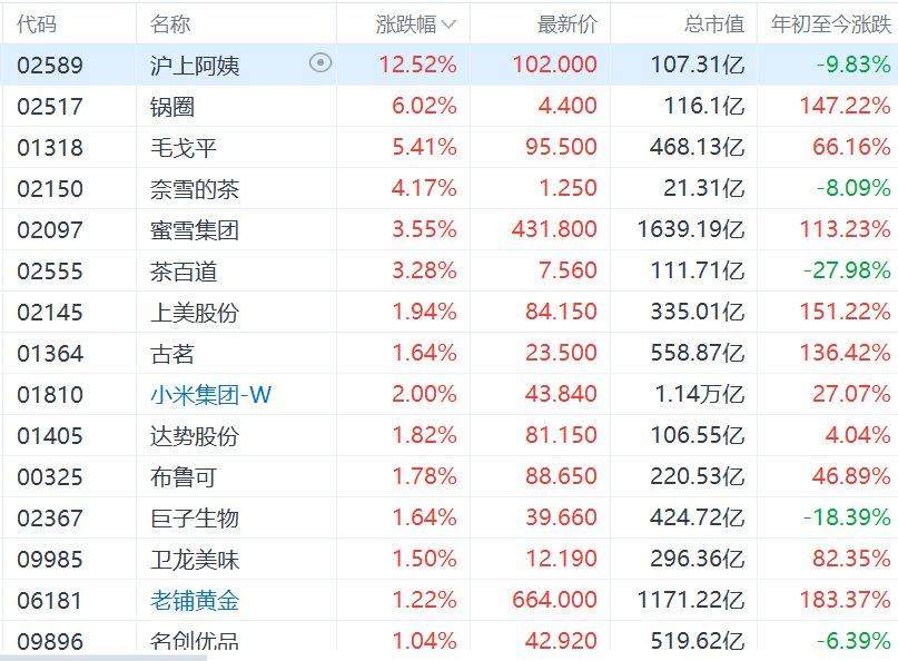 格隆汇11月12日|港股市场新消费概念股集体走强,其中,沪上阿姨涨近13%,锅圈涨6%,毛戈平涨超5%,奈雪的茶涨超4%,蜜雪集团、茶百道涨超3%。
