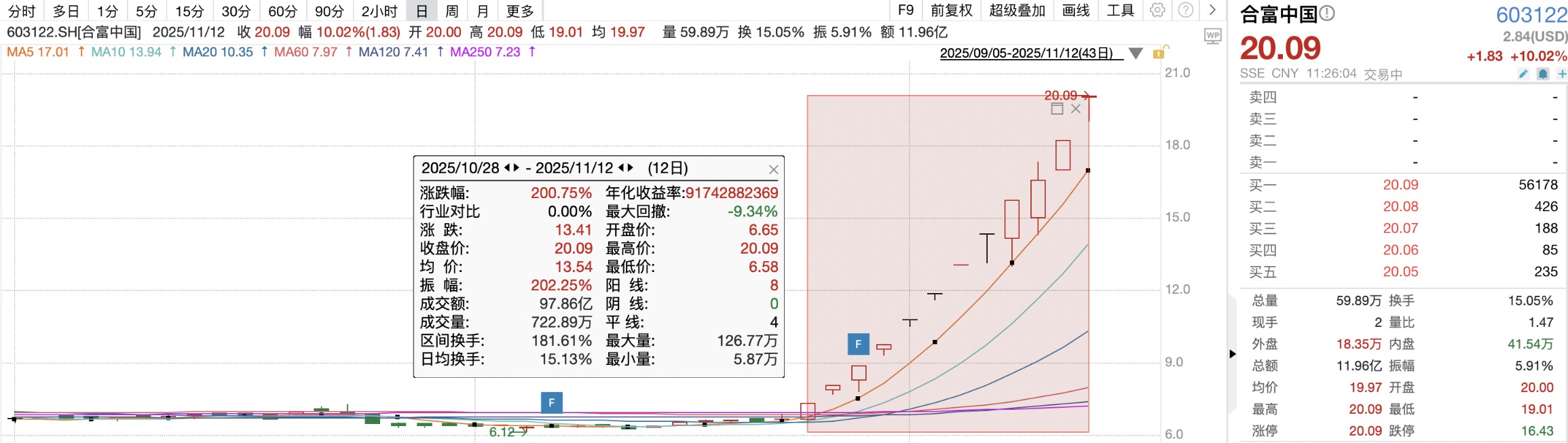 炒股第一步,先开个股票账户 在业绩持续亏损的情况下,合富中国(603122.SH)却走出了“12天11板”行情。 11月12日,合富中国股票开盘涨停,中间虽一度打开涨停板,但随后再度涨停。截至午间收盘,Wind数据显示,合富中国股票从10月28日的6.65元/股一路飙升至11月12日的20.09元/股,累计涨幅高达200.75%,总市值也从不足30亿元膨胀至80亿元。 ![]() 合富中国市场行情(数据来源:Wind) 合富中国的业务范围包括临床诊疗AI辅助系统、远程医疗推动优质医疗资源的下沉与共享、医院精细化运营管理、两岸医疗专家合作交流、科研成果转化及商业落地、体外诊断试剂及耗材精细化管理服务等。公司被市场炒作的主要概念包括医疗AI和两岸医疗合作,尽管合富中国股价表现疯狂,但其所谓的“概念炒作”与实际业务进展之间存在较大差距。 合富中国的股价狂欢始于10月28日,其间除了11月10日未涨停外,其余交易日全部以涨停价收盘。从10月30日开始,合富中国频繁发布股票交易风险提示公告,截至11月11日晚间,该公司已连续发布9份风险提示公告。在这些公告中,合富中国指出:“公司股价累计涨幅已严重偏离基本面,随时有快速下跌风险”“当前股价存在明显泡沫化特征”“击鼓传花效应明显”。 然而数份股票交易风险提示并未让公司股价走势趋于合理,反而股价异动愈演愈烈。合富中国在11月11日晚间最新发布的风险提示公告中更是直言:“自10月28日至11月11日,公司股票连续十一个交易日中有十个交易日以涨停价收盘,并4次触及股价异常波动、2次触及严重异常波动情形。公司主营业务未发生重大变化,且处于亏损状态。股价短期内连续上涨,存在市场情绪过热、非理性炒作风险,已明显高于同期行业及上证指数涨幅,且严重显著偏离公司基本面,随时存在快速下跌风险。” 合富中国2025年第三季度报告显示,前三季度实现营业收入5.49亿元,同比下降22.80%;归属于上市公司股东的净利润为-1238.62万元,同比下降146.65%。 ![]() 合富中国财务摘要(数据来源:Wind) 合富中国表示,业绩下滑的主要原因系受国内宏观形势变动,以及集中采购降价等医疗行业政策调整的影响,公司面向医院客户的产品采购单价有所下调,叠加同期订单采购量较上年出现缩减,导致公司销售收入与利润水平同步下滑。公司已落地多项费用管控举措,但短期内费用的下降幅度尚未能完全抵消收入端的下滑影响,进而导致公司短期经营业绩面临一定压力,存在业绩波动的风险,目前股价涨幅与公司经营情况严重偏离。 更令人担忧的是公司的估值水平。截至11月11日,合富中国的静态市盈率高达263.67倍,而根据中证指数有限公司的数据,公司所属的批发业行业静态市盈率仅为30.52倍,存在公司股价严重偏离同行业上市公司合理估值的风险。 从交易数据来看,龙虎榜数据显示,合富中国近一个月累计上榜11次,累计买入107.46亿元,累计卖出106.27亿元,累计净买入1.19亿元。 在众和昆仑(北京)资产管理有限公司董事长柏文喜看来,合富中国的股价上涨完全脱离基本面支撑,属于典型的情绪炒作。 北京博星证券投资顾问有限公司研究所所长邢星在接受《证券日报》记者采访时表示,合富中国之所以成为炒作的目标,主要是因为其流通盘小、股价低、概念贴合热点等特点,便于游资快速拉抬和出货。 柏文喜对《证券日报》记者表示,从历史经验来看,这类由游资主导的短期炒作行情往往来得快去得也快,一旦游资获利了结,股价很可能出现断崖式下跌,跟风买入的散户投资者将面临巨大风险。 全新妙想投研助理,立即体验 (文章来源:证券日报) |