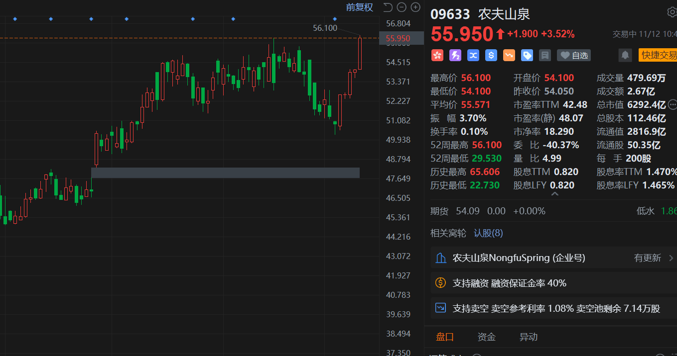 格隆汇11月12日|农夫山泉(9633.HK)延续涨势,现涨3.5%报56.1港元,刷新近期阶段新高,近5日累计涨超10%走出反转行情,市值6282亿港元。