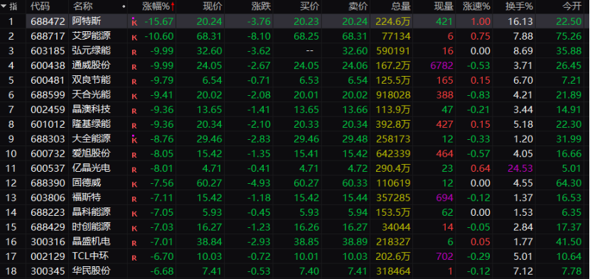 涨得好好的光伏板块突然就不行了! 11月12日盘中,突然有消息在互联网上传播:某晶澳科技高管在参加光伏月度例会时称“(收储)平台黄了。”此前,“光伏产能收储17家企业基本都已签字”的消息引爆整个光伏板块,阿特斯近期涨幅接近翻倍。隆基绿能、晶澳科技等近期亦有显著涨幅。 然而,今天,光伏板块迎来了大跳水。阿特斯一度跌超17%,光伏ETF一度跌超4%,通威股份、隆基绿能、晶澳科技接近跌停。整个板块辨识度较高的个股几乎是全线暴跌。 那么,事情是否如传闻中一般? 全线崩跌 最近表现较强的光伏,今天跌疯了。阿特斯、艾罗能源、弘元绿能、通威股份、双良节能、天合光能等全线大幅走弱。 ![]() 盘中,一则不利消息突袭整个板块。微信群传播一张截图,截图的主要内容指:在光伏一个月例会中,某晶澳科技高管公开称(收储)平台黄了。光伏“反内卷”出现重大变数。 随后,晶澳科技对媒体表示,公司真诚期待并支持收储平台能够顺利建立并发挥作用。同时,平台的具体落地实施过程中,仍需各方协同,共同克服一系列现实挑战,推动行业健康发展。公司始终坚定看好并充分相信,光伏行业反内卷的相关政策必将落地实施,并将积极支持和配合各项工作。 在此前的10月28日央视财经频道播出的《经济半小时》节目中,协鑫集团董事长朱共山就国内光伏龙头联合收储产能一事称:“我跟TCL李东生董事长见面,我也跟隆基绿能的钟宝申总沟通。我们17家(龙头)企业基本上都签字了。”这一表述,引发了市场对于光伏板块的追捧,相关股票近期表现非常强势。 “反内卷”或将持续 上述事件发酵之后,又有光伏协会相关人士的微信朋友圈截图流传出来。其主要内容是:我相信,有中央的坚定指导支持,行业企业的协调配合,相关工作一定会成功,光伏行业不走出内卷式恶性竞争我们誓不罢休。同时我也正告这些造谣者,不要低估政策决心,假的真不了!妄图通过造假、造谣混水摸鱼,牟取不当利益迟早是要还的。行业自律和反内卷,核心目的就是要让市场恢复到公平竞争的环境中来,光伏行业高质量发展就是要让重诺守信的企业发展得更好。那些不自律的企业,如果还妄图利用无底线的不公平竞争获利,那就是打错了算盘,迟早要完! 财信研究院认为,“内卷式”竞争是指经济主体为维持或争夺有限市场空间,不断投入资源却未带来整体收益增长的恶性竞争现象。近年来这一现象在各行业普遍蔓延,推动“反内卷”从网络热词升级为国家政策重点。近一年来高频率、大力度出台的“反内卷”相关政策,标志着从认知到执行、从中央到地方的系统性政策框架正在全面确立。 中信证券认为,“内卷式”竞争不仅压制了物价水平与企业利润,也造成了产业升级与居民增收的传导不畅通。短期内综合整治“内卷式”竞争,需要结合不同行业特点有的放矢,关注有色、钢铁、光伏等重点行业。长期来看,需要在建设全国统一大市场的框架下,规范地方经济促进行为,并完善相应考核机制。从这个角度来看,光伏的反内卷应该不会就此停止。 中邮证券认为,光伏产业存在供需预期差,供给的“反内卷”行动持续推进,另一方面,中国于2025年11月3日正式提交2035年国家自主贡献,中国是能源转型的行动派,需求的改善有望提前到来。 开源证券表示,当前光伏行业反内卷已取得一定积极成效,三季度主链上游环节预计显著减亏。后续重点关注供需两条主线:一是供给侧:硅料收储平台落地及产业链限产措施。二是需求侧:关注“十五五”光伏装机需求支撑,出口退税取消及严禁低于成本价销售要求的执行。在供需两端反内卷的推进下,产业链供需关系有望迎来快速修复,并推动组件价格抬升。