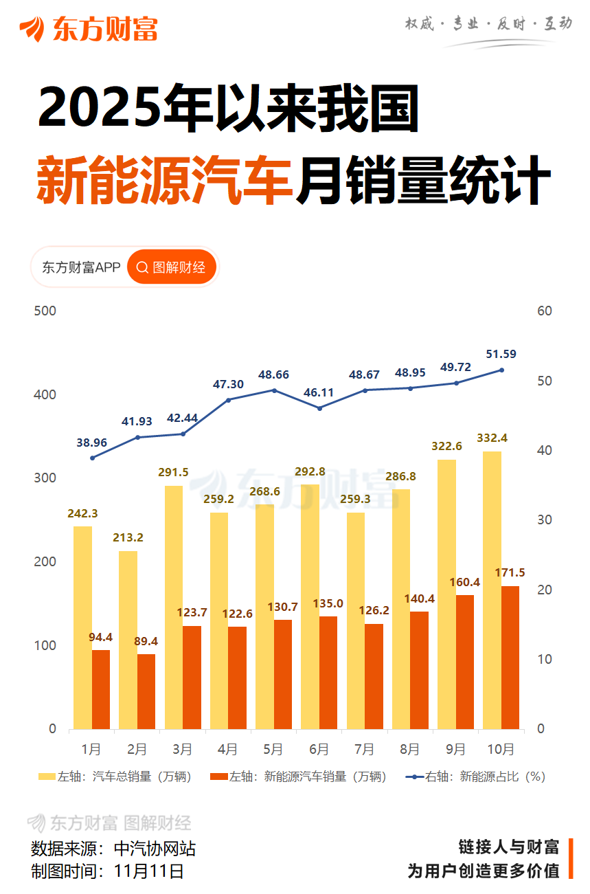 10月,国内新能源汽车市场迎来里程碑式突破——销量首次超越汽车总销量的50%。在规模实现跨越式增长的同时,行业格局也迎来显著洗牌。 在10月新能源车企零售销量TOP10榜单中,头部阵营位次小幅变动,新势力品牌持续强势突围,特斯拉中国则因销量大幅下滑无缘前十。 整体市场:新能源市场需求出现内部分化 整体市场来看,据乘联分会发布数据显示,10月乘用车厂商生产、出口、批发均创当月历史新高。 10月份新能源狭义乘用车销量128.1万辆,同比增长7.2%,环比下降1.4%;今年1至10月累计销量1015.0万辆,同比增长21.9%。 乘联分会分析指出,今年新能源市场出现结构性差异,纯电车零售仍大幅增长,增程与插混则进入慢速增长期,标志着新能源市场需求出现了内部分化。 具体品牌:小米连续两月破4万,特斯拉落榜 具体品牌方面,10月新能源车企TOP10榜单迎来小幅调整:赛力斯汽车成功跻身前十,特斯拉中国则遗憾落榜。其余上榜车企名次虽无大幅调整,但增长表现差异显著,9家上榜车企实现同比正增长,6家车企达成环比正增长。 以下是10月新能源车企零售销量TOP10: ![]() 比亚迪汽车以295871辆的零售销量蝉联10月冠军,尽管同比下滑31.4%、环比下滑14.8%,仍稳固占据头部位置;吉利汽车则以164256辆的零售销量位居第二,凭借同比54.7%的大幅增长与9.1%的环比提升,进一步缩小了与榜首的差距。上汽通用五菱以99,752辆的零售销量超越长安汽车跻身前三,同比增长20.7%、环比大涨27.2%。 鸿蒙智行10月交付新能源汽车68216辆位列榜单第五,创单月交付量历史新高。全系累计交付已突破100万辆。鸿蒙智行目前旗下有问界、智界、享界、尊界、尚界等五个品牌。其中,问界由赛力斯和华为合作。赛力斯汽车10月以44352辆的零售销量位列第九,同比增长30.4%、环比增长9.2%。10月30日晚,赛力斯发布2025年三季报显示,赛力斯前三季度实现营业收入1105.34亿元;净利润53.12亿元,同比增长31.56%。 小米汽车以48654辆的零售销量位列第八,不仅实现连续两个月交付量破4万辆的稳健表现,更凭借134.7%的同比大幅增长、继续坐稳榜单中同比涨幅最大品牌的位置。 值得注意的是,特斯拉中国10月交出了三年以来最差成绩单。10月份特斯拉中国的零售销量为26006辆,较9月的71525辆环比减少63.64%,较2024年同期的40485辆同比下降35.76%,为2022年11月以来最低水平。