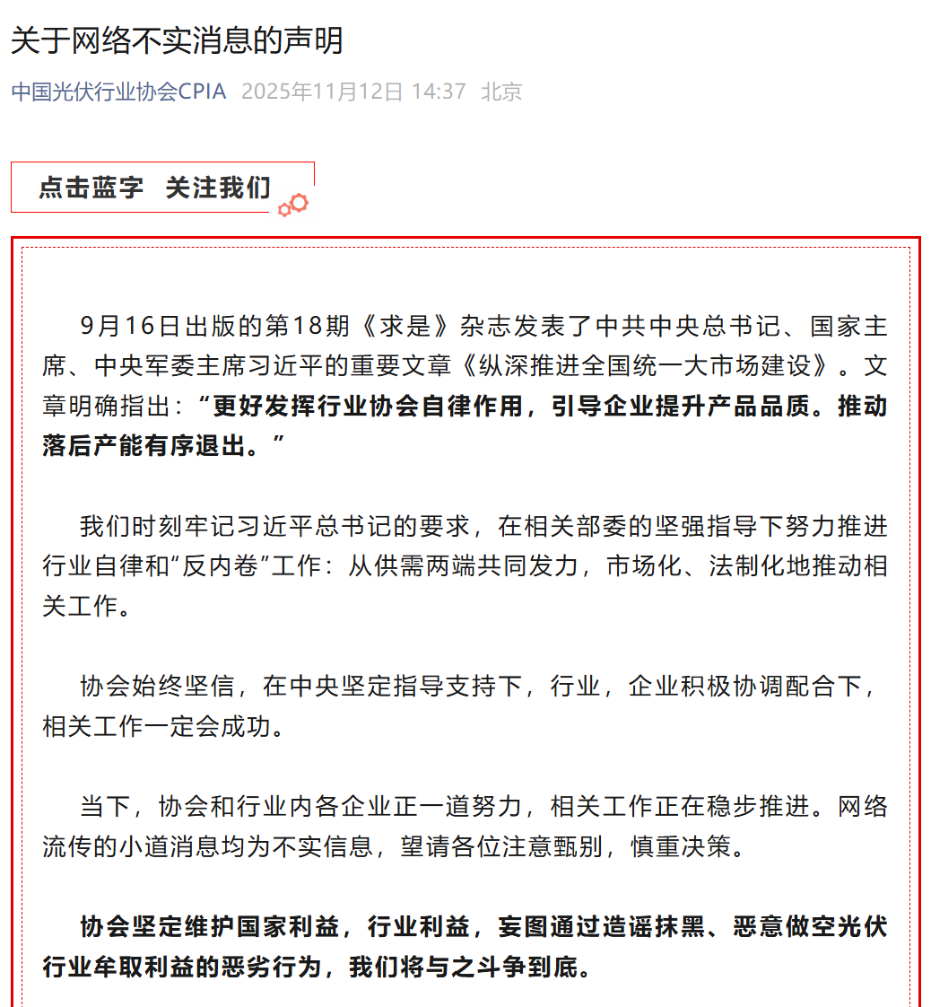 今天的市场,深“V”大逆转,一起看看发生了什么事情。 A股深“V” 11月12日,A股全天探底回升,三大指数小幅下跌。截至收盘,沪指跌0.07%,深成指跌0.36%,创业板指跌0.39%。 市场共1758只个股上涨,77只个股涨停,3563只个股下跌。 ![]() 医药股集体走强,细胞免疫治疗方向领涨,开能健康、济民健康等多股涨停。 ![]() 油气股全天强势,石化油服、准油股份封板。 ![]() 银行板块冲高,农业银行、工商银行齐创历史新高。 ![]() 下跌方面,超硬材料概念股走低,沃尔德跌超10%。 ![]() 光伏小作文搅动市场 12日,市场流传一篇关于光伏反内卷的小作文,搅乱了市场情绪。 受此影响,午后光伏、储能概念股持续调整,通威股份触及跌停,阿特斯、艾罗能源跌超10%,双良节能、晶澳科技、隆基绿能、天合光能跌幅靠前。 ![]() 随后,中国光伏行业协会官微紧急发布声明称,协会在相关部委的坚强指导下努力推进行业自律和“反内卷”工作:从供需两端共同发力,市场化、法制化地推动相关工作。协会始终坚信,在中央坚定指导支持下,行业,企业积极协调配合下,相关工作一定会成功。 当下,协会和行业内各企业正一道努力,相关工作正在稳步推进。网络流传的小道消息均为不实信息,望请各位注意甄别,慎重决策。协会坚定维护国家利益,行业利益,妄图通过造谣抹黑、恶意做空光伏行业牟取利益的恶劣行为,我们将与之斗争到底。 ![]() ![]() ![]() 受最新辟谣消息影响,多晶硅期货主力合约强势反弹,日内由跌转涨,此前一度跌近4%。 ![]()