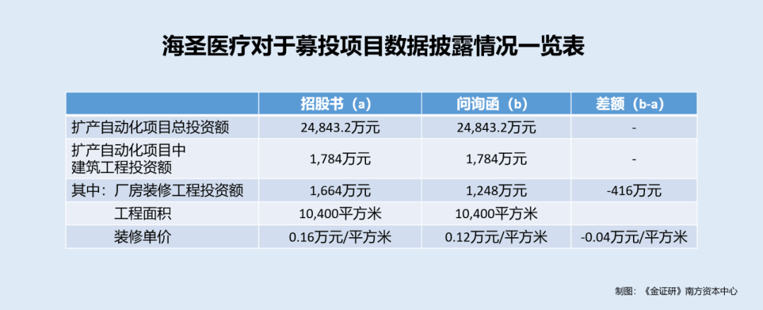 《金证研》南方资本中心 池恩/作者 易溪 南江 映蔚/风控 经历15年的医生生涯后,黄海生创立了浙江海圣医疗器械股份有限公司(以下简称“海圣医疗”),主营麻醉、监护类医疗器械产品的研发、生产和销售。发展至今,海圣医疗迈入申报北交所上市的队列,在2025年11月7日上市委审议会议中,海圣医疗被问及关于行业政策影响、关于有源设备研发与产业化等问题。 另一方面,此番上市,对于其中一项募投项目中的厂房装修工程投资额,海圣医疗招股书与问询回复或现“不同版本”。同样关于该募投项目,环评报告披露其施工工期为24个月,招股书披露该项目从建筑工程到竣工验收的建设周期为36个月。此外,海圣医疗自称生产质量管理具备良好的内控基础,而其一次性使用麻醉穿刺包产品在2023-2024年曾因无菌规范问题被要求限期整改。与此同时,海圣医疗宣布开始合作的一家境内供应商,近三年曾两次召回不合格产品。 一、募投项目的细分投资概算现“不同版本”,施工工期或现信披疑云 募投项目实施系投资者对于拟上市公司的关注重点。此番上市,海圣医疗募集资金遭两轮问询。此外,关于其中一项募投项目的厂房装修工程投资额,招股书与问询回复或“对不上”。 1.1 募集资金遭两轮问询,此番上市拟募资1.74亿元投入扩产自动化项目 据海圣医疗签署于2025年10月31日的招股说明书(以下简称“签署于2025年10月31日招股书”)及签署于2025年10月10日的公开发行股票并在北京证券交易所上市申请文件的审核问询函的回复(以下简称“首轮问询回复”),此番上市,海圣医疗拟募资3.7亿元,分别投入麻醉监护急救系列医疗器械升级扩产及自动化项目(以下简称“扩产自动化项目”)、研发检测中心项目、营销服务基地建设项目。 其中,“扩产自动化项目”的投资总额为2.48亿元,拟使用募集资金投入1.74亿元。 该项目的实施主体为海圣医疗,建设地点位于浙江省绍兴市越城区震元路8号,建设内容为通过对现有厂房和生产车间进行装修升级改造,引入自动化生产硬件设备以及相关配套软件,同时也对现有仓库进行装修改造,引进智能仓储设备。该项目拟新增年产能1,800万件套麻醉监护急救系列医疗器械。 值得注意的是,截至查询日期2025年11月11日,监管层已对海圣医疗发出两轮问询,其中两轮问询中均对海圣医疗的募集资金提出问询。 在首轮问询中,北交所要求海圣医疗结合报告期内各细分产品产能利用率及产销率以及本次拟扩大产能情况,说明扩产的合理性;结合下游市场需求变动、现有客户在手订单、潜在客户开发等情况说明本次募投新增产能是否能够有效消化。在二轮问询中,北交所要求海圣医疗结合同行业可比公司或所处地区同类企业相关项目购置、人员招募成本的对比情况,说明募集资金规模测算的合理性。 奇怪的是,海圣医疗在招股书以及问询回复中,披露的关于扩产自动化项目的建筑工程相关数据或“对不上”。 1.2 招股书披露扩产自动化项目中的厂房装修工程投资额,比问询回复披露金额多416万元 据签署于2025年10月31日招股书,海圣医疗的扩产自动化项目总投资额为24,843.2万元,投资项目投资概算包括建筑工程、设备购置及安装、基本预备费和铺底流动资金。 其中,建筑工程的投资金额为1,784万元,占总投资比例为7.18%。该项目的建筑工程包括厂房装修工程、智能仓储装修。 对于厂房装修工程,其总投资金额为1,664万元,涉及面积为10,400平方米,单位造价为1,600元/平方米。智能仓储装修的总投资金额为120万元,涉及面积为7,000平方米,单位造价为171.43万元。 据海圣医疗签署于2025年10月10日的公开发行股票并在北京证券交易所上市申请文件的审核问询函的回复(以下简称“首轮问询回复”),海圣医疗披露,募投项目“扩产自动化项目”的总投资金额为24,843.2万元,其中建筑工程的投资金额为1,784万元。 该项目的工程费用投资包括厂房装修工程、智能仓库装修工程及安装工程等费用。其中,工程费用主要为厂房装修工程,合计装修面积10,400平方米,平均装修单价1,200元/平方米。 据海圣医疗签署于2025年10月10日的公开发行股票并在北京证券交易所上市申请文件的第二轮问询函的回复(以下简称“二轮问询回复”),海圣医疗披露此番上市募投项目的购置装修工程情况。其中,募投项目“扩产自动化项目”的厂房装修工程的工程面积为10,400平方米,装修单价为1,200元/平方米,投资金额为1,248万元。