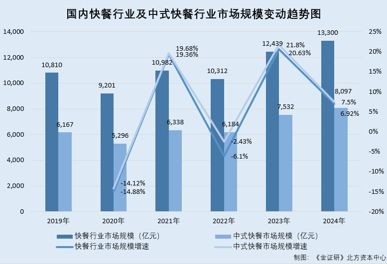 “故事”才刚刚开始。 据2025年6月30日招股书,截至2022-2024年及2025年4月末,老乡鸡的直营店数量分别为1,007家、973家、914家、911家,加盟店分别为118家、226家、565家、653家。同期,前述加盟店中由直营店转为加盟店的数量分别为25家、77家、146家、23家。 2022-2024年及2025年1-4月,老乡鸡直营店的毛利率分别为19.8%、23.5%、23.5%、25%,加盟店的毛利率分别为28.9%、23.9%、20.1%、24%。 经测算,截至2022-2024年各期末及2025年4月30日,老乡鸡加盟店中由直营店转为加盟店的数量,占加盟店总数量的比例分别为21.19%、34.07%、25.84%、3.52%。且2022-2024年,老乡鸡加盟店的毛利率呈下滑趋势。 1.2 行业竞争格局分散前五名市场参与者合计市占率仅3.6%,老乡鸡市占率0.9%位居行业第一 据2025年6月30日招股书,国内中式快餐竞争格局较为分散,有超过170万家餐厅。2024年前五名的交易总额仅占整体市场规模的3.6%。 2024年,以交易总额计算,老乡鸡在国内中式快餐行业市场份额为0.9%,位列第一。需要说明的是,2024年,国内中式快餐企业排名第二、三、四、五位企业的市场份额分别为0.9%、0.8%、0.6%、0.4%。 据老娘舅餐饮股份有限公司(以下简称“老娘舅”)2024年年报,老娘舅系一家中式快餐连锁企业。2023-2024年,老娘舅的营业收入分别为16.97亿元、14.81亿元,净利润分别为1.04亿元、0.18亿元。 根据《金证研》北方资本中心测算,2024年,老娘舅营收增速、净利增速分别为-12.72%、-83.1%。 可以发现,老乡鸡虽然自称为国内中式快餐市场份额排名第一,而市场份额排名第二至五位的企业市占率在0.4%-0.9%之间。此外,2024年,中式快餐连锁企业老娘舅净利润增速同比下降83.1%。 1.3 所处的中式快餐市场规模增速坐“过山车”,2024年由2023年的21.8%下滑至7.5% 据2025年6月30日招股书,国内快餐市场以提供的产品类型分包括三个分部,即中式快餐、西式快餐、其他。需要说明的是,老乡鸡即为一家中式快餐企业。 2019-2024年,国内快餐市场规模分别为10,810亿元、9,201亿元、10,982亿元、10,312亿元、12,439亿元、13,300亿元。同期,国内中式快餐市场规模分别为6,167亿元、5,296亿元、6,338亿元、6,184亿元、7,532亿元、8,097亿元。 经测算,2020-2024年,国内快餐行业市场规模增速分别为-14.88%、19.36%、-6.1%、20.63%、6.92%。同期,国内中式快餐行业市场规模增速分别为-14.12%、19.68%、-2.43%、21.8%、7.5%。