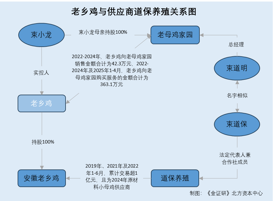 1.4 老乡鸡直营店与加盟店顾客人均消费额呈下滑趋势,2024年国内社会消费品零售总额增速下滑 据2025年6月30日招股书,2022-2024年及2025年1-4月,老乡鸡直营店顾客人均消费额分别为29.7元、27.7元、27.5元、28元,加盟店顾客人均消费额分别为31.5元、29.3元、28.9元、29.2元。 此外,据国家统计局数据,2020-2024年,国内社会消费品零售总额分别为39.05万亿元、43.84万亿元、43.64万亿元、46.71万亿元、48.33万亿元。 经测算,2021-2024年,国内社会消费品零售总额同比增长率分别为12.25%、-0.43%、7.02%、3.48%。 不难看出,2022-2024年,老乡鸡直营店及加盟店顾客人均消费额呈现下滑趋势。且2024年国内社会消费品零售总额增速下滑,同期老乡鸡所处的中式快餐市场规模增速由21.8%下滑至7.5%。在此背景下,老乡鸡加盟店毛利率逐年下滑,同期加盟店中转自直营店的数量呈上升趋势。 二、合作社类供应商曾累计撑起超亿元采购额,该供应商成员与实控人母亲控制企业的总经理或关系待解 一波未平一波又起。2024年,老乡鸡境内运营主体官网披露当期供应商名单,其中包括一家为合作社性质企业。然而,前述合作社性质的供应商的法定代表人兼成员,与老乡鸡实控人母亲控制企业的总经理名字仅“一字之差”。 2.1 供应商道保养殖曾累计撑起超亿元采购额,且为彼时前五大供应商中唯一的合作社 据2025年6月30日招股书,安徽老乡鸡餐饮有限公司(前称合肥肥西老母鸡餐饮有限责任公司及安徽老乡鸡餐饮股份有限公司,以下简称“安徽老乡鸡”)系老乡鸡间接全资子公司。安徽老乡鸡系老乡鸡在境内的运营主体。 据安徽老乡鸡申报沪主板期间签署于2023年2月23日的招股说明书(以下简称“安徽老乡鸡签署于2023年2月23日的招股书”),2019年、2021年及2022年1-6月,合肥市道保家禽养殖专业合作社(以下简称“道保养殖”)分别为安徽老乡鸡第一大、第四大、第五大供应商,安徽老乡鸡向道保养殖的采购金额分别为6,460.25万元、5,655.18万元、2,084.7万元,占安徽老乡鸡当期采购总额的比例分别为6.61%、3.54%、3.05%。 2019-2021年及2022年1-6月,安徽老乡鸡的前五大供应商中,仅道保养殖一家企业为合作社性质。 经测算,2019年、2021年及2022年1-6月,安徽老乡鸡向道保养殖累计采购金额为1.42亿元。 据市场监督管理局数据,道保养殖成立于2016年5月20日,截至查询日2025年11月11日企业类型为农民专业合作社。 即是说,2019年、2021年及2022年1-6月,安徽老乡鸡向道保养殖累计采购超亿元,且道保养殖系彼时前五大供应商中唯一合作社性质企业。 “问题”才刚开始。 2.2 2024年道保养殖为小母鸡供应商,而另外的小母鸡供应商包括上市企业 据安徽老乡鸡官网公开信息,安徽老乡鸡签署于2024年4月2日的《老乡鸡菜品溯源报告》(以下简称“溯源报告”)显示,安徽老乡鸡原材料小母鸡的供应商分别为合肥温氏家禽有限公司(以下简称“合肥温氏”)、江山温氏畜牧有限公司(以下简称“江山温氏”)、衢州温氏畜牧有限公司(以下简称“衢州温氏”)、无为温氏家禽有限公司(以下简称“无为温氏”)、合肥立华畜禽有限公司(以下简称“合肥立华”)、道保养殖。 据温氏食品集团股份有限公司(以下简称“温氏股份(300498)”)2025年半年报,截至2025年6月末,合肥温氏、江山温氏、衢州温氏、无为温氏皆为温氏股份全资子公司。 据江苏立华食品集团股份有限公司(以下简称“立华股份(300761)”)2025年半年报,截至2025年6月末,合肥立华为立华股份全资子公司。 即是说,2024年,道保养殖仍为安徽老乡鸡的供应商,且同期供应商还现两家上市企业温氏股份、立华股份的“身影”。 此外,道保养殖的法定代表人,与老乡鸡实控人母亲控制企业的总经理名字相似。 2.3 实控人母亲控制企业的总经理为束道明,道保养殖法定代表人兼成员为束道保 据2025年6月30日招股书,截至最后实际可行日期2025年6月30日,束小龙、束小龙胞妹束文、束小龙配偶董雪直接间接分别持有老乡鸡70.78%、15.02%、6.22%股份,合计拥有老乡鸡92.02%的投票权,系老乡鸡的控股股东。 此外,张琼为老乡鸡控股股东束小龙、束文的母亲。合肥肥西老母鸡家园有限公司(以下简称“老母鸡家园”)为老乡鸡一名近亲家庭成员控制的企业。 2022-2024年,老乡鸡向老母鸡家园销售金额分别为22万元、18.9万元、1.4万元。2022-2024年及2025年1-4月,老乡鸡向老母鸡家园购买服务的金额分别为147.6万元、71.6万元、128.4万元、15.5万元。 经测算,2022-2024年,老乡鸡向老母鸡家园销售金额合计为42.3万元,2022-2024年及2025年1-4月,老乡鸡向老母鸡家园购买服务的金额合计为363.1万元。 据安徽老乡鸡签署于2023年2月23日的招股书,截至签署日,安徽老乡鸡的实控人分别为张琼、束小龙、束文、束从轩、董雪。其中,张琼为束小龙、束文的母亲,老母鸡家园为张琼控制的企业。 据市场监督管理局数据,老母鸡家园成立于2006年6月1日。截至查询日2025年11月11日,张琼为老母鸡家园的法定代表人、唯一股东,且担任老母鸡家园执行董事。此外,束道明担任老母鸡家园总经理。 需要指出的是,2022年2月23日,老母鸡家园进行高级管理人员变更。变更前,老母鸡家园的高级管理人员为张琼、束晶晶,变更后为张琼、束晶晶、束道明。 巧合的是,老母鸡家园总经理与道保养殖法定代表人名字相似。 据溯源报告,道保养殖的联系人为束先生,联系方式为138