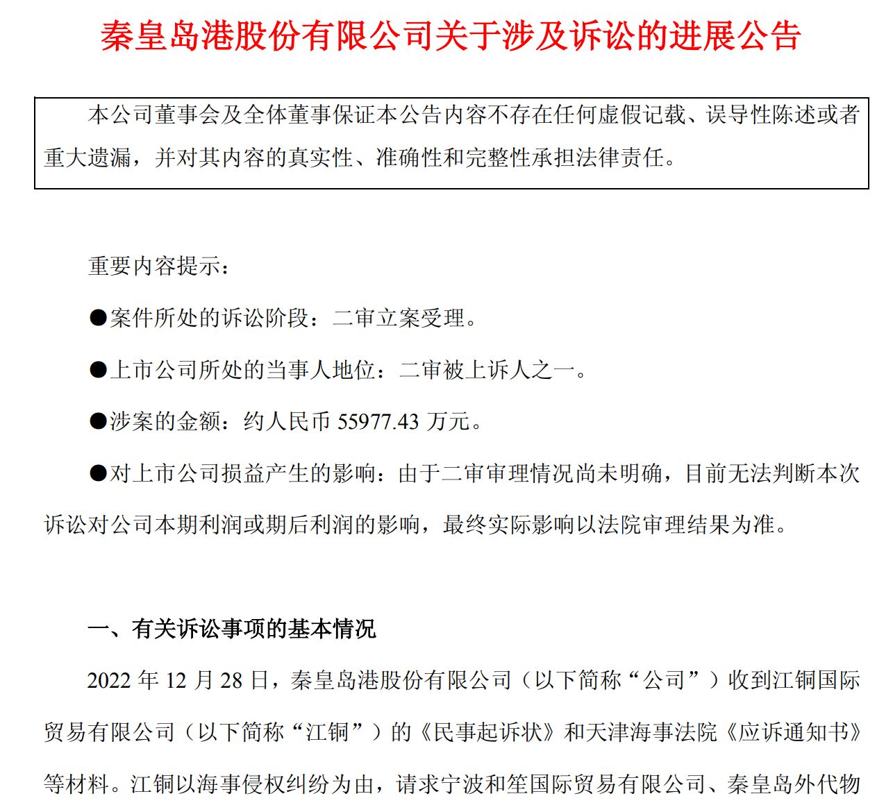 2022年闹得沸沸扬扬的“秦皇岛港60亿元铜精矿‘失踪’事件”,使秦港股份(601326.SH,股价3.71元,市值207.29亿元)后来卷入多起诉讼案。直到现在,由该事件引起的诉讼纠纷仍未了结。 11月12日晚间,秦港股份发布最新诉讼进展公告称,江铜国际贸易有限公司(以下简称“江铜公司”)近日向天津市高级人民法院提起上诉,并获得法院立案,案件涉及金额约为5.6亿元。由于二审审理情况尚未明确,秦港股份目前无法判断本次诉讼对公司本期利润或期后利润的影响。 ![]() 图片来源:秦港股份公告 《每日经济新闻》记者(以下简称“每经记者”)留意到,去年8月,秦港股份曾披露上述江铜案的一审民事裁定书。天津海事法院裁定,驳回江铜公司的起诉。原因是该案与秦皇岛市中级人民法院当时正在审理的宁波和笙国际贸易有限公司(以下简称“宁波和笙”)涉嫌合同诈骗罪的刑事案件基本事实相同,江铜公司亦作为受害人参与了刑事审理程序。“刑事案件审结后,原告如仍有损失的,可另行依据民事法律关系提起诉讼。” 时隔一年多,江铜公司再次提起上诉,继续追偿,秦港股份是二审被上诉人之一。不过,对于“秦皇岛港60亿元铜精矿‘失踪’事件”引来的多起诉讼,秦港股份管理层坚持认为,公司不存在任何违约行为,也未向各方承诺提供担保或承担连带责任。截至今年6月末,公司未计提与这些铜精矿诉讼相关的预计负债。 江铜公司再提上诉,索赔金额降至5.6亿元 据每经记者了解,2022年8月,存储在秦皇岛港的总价值近60亿元铜精矿被爆出离奇“失踪”。据当时媒体报道,13家货主总价值60亿元的30万吨铜精矿在没有货主提供放货通知书的情况下被第三方转走。而该事件发生的地点就在秦皇岛港,由秦港股份提供港口作业服务。 彼时,秦港股份澄清表示,公司未参与此项贸易纠纷,亦未作为被告方进入诉讼程序;公司作为港口企业提供港口作业服务,与货代公司签订两方合同,根据货代公司指令出入库。 2022年12月底,秦港股份披露,2022年8月22日至12月28日,公司发生铜精矿系列案件共九起,原告分别为陕西鼓风机(集团)有限公司(以下简称“陕西鼓风机”)、中国化纤有限公司(以下简称“中国化纤”)、安徽普来泽贸易有限责任公司(以下简称“普来泽”)、江铜公司,诉讼总金额高达19.29亿元。 在江铜案中,江铜公司以海事侵权纠纷为由,请求宁波和笙、秦皇岛外代物流有限公司、中国秦皇岛外轮代理有限公司、秦港股份连带赔偿货物损失约7.83 亿元,并承担诉讼费、保全费。 2024年8月,秦港股份公布中国化纤案、普来泽案和江铜案的一审裁定结果,法院驳回了中国化纤、普来泽、江铜公司的起诉。 2025年11月12日晚间,秦港股份披露最新进展称,上诉人江铜公司不服天津海事法院作出的一审裁定,向天津市高级人民法院提起上诉,天津市高级人民法院已立案。涉案金额从此前的7.83亿元降至约5.6亿元。 秦港股份称,公司已选聘专业律师团队积极跟进案件进展情况,全力、切实维护公司及全体股东合法权益。 公司坚称无违约且未担责,未计提预计负债 每经记者注意到,除前述江铜案外,在11月12日晚间的公告中,秦港股份还透露了其他几起涉铜精矿纠纷案的最新进展。 其中,陕西鼓风机起诉秦皇岛外代物流有限公司、秦港股份一案,涉案金额为4.7亿元。目前,天津海事法院已经恢复对该案的审理,尚未开庭;中国化纤案、普来泽案目前均处于“裁定驳回起诉,已结案”状态。 秦港股份在2025年半年度报告中称,公司关于铜精矿案诉讼标的金额合计约17.8亿元。公司管理层认为,公司仅与外代物流签署港口作业合同,与其他各方均无任何合同关系。公司相关港口作业严格按照与外代物流签署的港口作业合同约定进行,不存在任何违约行为。根据合同约定及行业惯例,秦港股份作为港口经营人无核实货物所有权实际归属的义务,也未向各方承诺提供担保或承担连带责任。截至2025年6月末, 公司未计提与这些铜精矿诉讼相关的预计负债。 据公开资料,秦港股份是全球领先的大宗干散货公众码头运营商。今年前三季度,公司实现营收52.12亿元,归母净利润13.91亿元,均同比增长。 (文章来源:每日经济新闻) |
