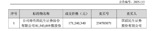 【导读】国联民生证券竞得民生证券8154.3万股股份 11月12日,国联民生证券公告称,当日公司通过司法拍卖竞得泛海控股持有的民生证券8154.3019万股股份(占民生证券总股本的0.72%),成交价格为1.71亿元,并已收到《成交确认书》。 国联民生表示,本次交易尚需办理股份交割等手续。本次交易完成后,公司持有民生证券的股份比例将由99.26%上升至99.98%。 ![]() 国联系持续加码 持股民生证券比例升至99.98% 国联系与民生证券的股权整合由来已久。2023年3月15日,国联证券控股股东国联集团竞得泛海控股持有的民生证券34.71亿股权,占民生证券股权的30.3%,成交价格为91.05亿元。 2024年,合并进程加速推进。5月15日,国联证券发布复牌公告,国联证券拟发行A股股份购买民生证券100%股份(后调整至99.26%),并募集不超过20亿元(含本数)配套资金。 同年12月30日,国联证券公告称,已完成发行A股股份购买民生证券99.26%股份的过户手续,并已将国联证券登记在民生证券股东名册,国联证券自当日起成为民生证券的股东,持有民生证券112.89亿股股份,占民生证券总股本比例为99.26%。 此次国联民生证券通过司法拍卖拿下剩余0.72%股权,进一步推进股权集中。国联民生证券公告明确,本次交易尚需办理股份交割等后续手续,交易完成后,公司持有民生证券的股份比例将由99.26%上升至99.98%。 泛海控股拍卖资产偿债 债务危机仍在持续 与国联民生证券的加码形成对比的是,转让方泛海控股正深陷债务泥潭。 今日,泛海控股公告,其持有的民生证券8154.302万股股份因债务纠纷被北京市第二中级人民法院通过京东司法拍卖网络平台进行公开拍卖,并于2025年11月12日以1.712亿元成交。泛海控股称,若本次拍卖标的物最终成交,将相应减少部分债务。 ![]() 泛海控股的债务危机已持续发酵多时。今年9月、10月,其控股股东中国泛海所持有的3.45亿股泛海控股股份先后两次司法拍卖流拍,北京二中院将于11月26日在阿里资产平台对该部分股份进行公开变卖。 此外,泛海控股子公司武汉中央商务区股份有限公司、武汉泛海城市广场开发投资有限公司,因未能清偿信达金融租赁17.9亿元融资,名下多处房地产被武汉中院裁定继续查封三年,涉及武汉世贸中心B地块、泛海国际中心等在建工程及房产。 财务数据同样不容乐观。10月31日,泛海控股发布2025年三季报,财报显示,公司三季度营业收入42.71亿元,同比下降5.29%;净利润亏损67.58亿元;总资产为515.32亿元,净资产亏损488.61亿元;经营现金流量净额为734.84万元。 截至最新,泛海控股及子公司截至2025年10月31日未能按期偿还有息债务合计341.59亿元,其中境内债券未偿本金余额47.37亿元,其他有息债务294.22亿元。主要因宏观经济环境、行业政策调控及公司自身经营问题导致流动性困难。 (文章来源:中国基金报) |
