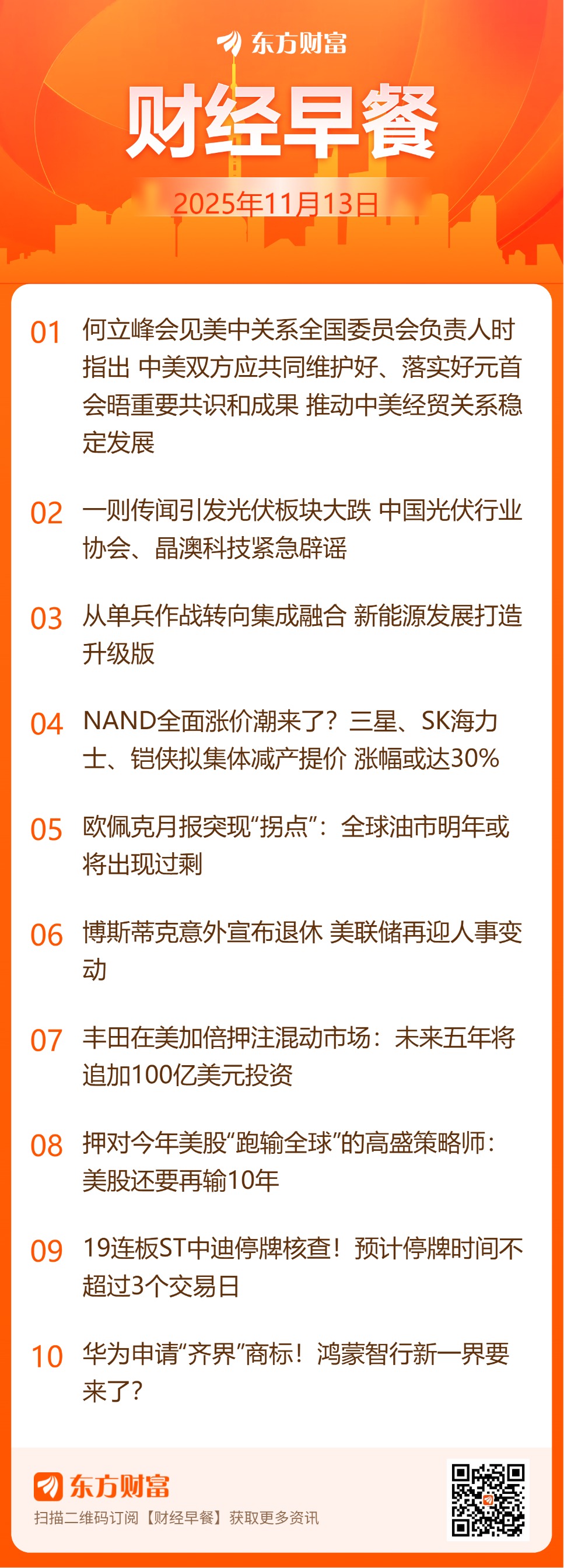 ![]() 每日精选中美经贸: 中共中央政治局委员、国务院副总理何立峰12日晚在京会见美中关系全国委员会董事会执行副主席格林伯格、会长欧伦斯。何立峰表示,中美在经贸领域拥有广阔合作空间,中美双方应相向而行,共同维护好、落实好两国元首釜山会晤重要共识和成果,加强合作、管控分歧,推动中美经贸关系稳定发展。 新能源集成融合发展: 国家能源局发布关于促进新能源集成融合发展的指导意见。其中提到,积极推动新能源与新兴产业融合互促发展。结合“东数西算”工程建设,统筹算力设施绿电需求和新能源资源禀赋,推动新能源基地与算力设施协同规划,探索依托海上风电基地就近建设算力设施。分类挖掘算力负荷时空可调节潜力,促进电力、算力双网融合运行,为加快构建全国一体化算力网提供绿色电力支撑。 光伏小作文辟谣: 12日,网传消息称,光伏行业酝酿的收储一事“黄了”。对此中国光伏行业协会执行秘书长刘译阳发文表示,光伏行业正从供需两端共同发力,市场化、法制化地推动落后产能有序退出。有中央的坚定指导支持,行业企业的协调配合,相关工作一定会成功,光伏行业不走出“内卷”式恶性竞争我们誓不罢休。同时,刘译阳喊话造谣者,称不要低估政策决心,假的真不了,妄图通过造假,造谣混水摸鱼,牟取不当利益迟早是要还的。 此外,晶澳科技公告称,近日,网络上流传关于公司的不实言论,引发部分关注。对此,公司澄清并郑重声明如下:公司董事会秘书未在任何内部或外部会议上发表过网传言论。相关内容系网络谣传,严重误导公众认知,损害公司及行业声誉。 存储芯片: 据外媒消息,三星目前正与海外大型客户讨论明年NAND的供货量,并在内部考虑将价格上调20%至30%以上。与此同时,三星、SK海力士、铠侠、美光这四大存储龙头今年下半年都纷纷削减NAND闪存供应量。业内分析认为,一方面原因在于这些公司希望通过调节供应来推动价格上涨;另一方面,随着AI需求推动更多产线转向四层单元(QLC)工艺中,NAND闪存产量下降在所难免。 富士康公布三季报: 鸿海精密(富士康)周三公布三季报,并对AI相关业务前景给出极为乐观的预期。鸿海三季度实现营收2.058万亿新台币(约合人民币4720亿元),符合预期;净利润576.7亿新台币(约合人民币132亿元),环比提高30%,显著超越市场预期的504亿新台币。鸿海董事长刘扬伟在周三的法说会上表示,随着新一代AI服务器机柜开始在四季度出货放量,预计四季度AI服务器营收将持续激增。鸿海预期,四季度AI服务器出货量将呈现“环比高两位数百分比”的增长。 曾毓群再谈固态电池: 11月12日,在2025世界动力电池大会上,宁德时代董事长曾毓群提到了当下市场热议的固态电池,表示在全固态电池方面,宁德时代的研究和产业化进度也处于全球前列。另外,宁德时代的换电体系能灵活兼容固态电池。此外曾毓群还提到,今年宁德时代巧克力换电联盟已在全国四十多个城市布局,到年底将建成1000座换电站。 储能需求: 本周三,瑞银证券表示,在人工智能数据中心的推动下,未来5年储能行业将进入“繁荣周期”,因为届时市场对于电力的需求将急速飙升,对于储能的需求也将水涨船高。瑞银证券电力及新能源分析师严亦舒预测,到2026年,全球储能需求可能同比增长40%,她认为,美国对人工智能数据中心的需求非常强劲,但电力是最大的瓶颈,因此储能需求将随之飙升。 华为汽车: 国家知识产权局商标局最新信息显示,华为技术有限公司近期申请注册了“齐界”商标,申请日期为今年6月16日,目前处于等待实质审查阶段。华为此举,在业界看来是华为将持续深耕智能汽车领域的重要信号。华为常务董事、终端BG董事长余承东近日也透露,鸿蒙智行全系交付已突破100万台,从零到百万,鸿蒙智行耗时约43个月。 热点题材创新药: 巨头百济神州近期公布三季度财报,数据显示公司单季度实现总收入14亿美元,较去年同期劲增41%,创下历史同期新高。三季度最大亮点或许是本季度GAAP净利润为1.25亿美元(约合8.7亿元人民币),同比扭亏为盈,相比去年同期 1.21 亿美元的净亏损,改善超过 2.46 亿美元。 仿生机器人: 据媒体报道,受小鹏全新一代人形机器人IRON的影响,近期仿生人形机器人引发了市场高度关注。多位行业人士对记者表示,高度仿生的设计、强烈的落地意愿、明确的应用场景,成为这一轮人形机器人爆发的新风向;未来2-3年,仿生人形机器人有望进入“交互实用化元年”。其中,仿生设计存在巨大潜力。 太空算力: 在2025年世界互联网大会“互联网之光”博览会上,国星宇航自主研发的“零碳太空计算中心”凭借其技术领先性与产业创新价值,获评本年度十大精品首发成果,彰显了我国在“人工智能+商业航天”领域的全球竞争力。 AI芯片: 当地时间11月11日,在财务分析师日活动上,AMD的CEO苏姿丰表示,市场对AI芯片的需求处于“无法得到满足”的状态,预计到2030年,包括芯片和系统在内的全球数据中心市场规模将增长至1万亿美元,意味着年均增长率达到40%。 脑机接口: 11月1日,由上海阶梯医疗科技有限公司自主研发的“植入式无线脑机接口系统”正式进入国家药品监督管理局医疗器械技术审评中心(CMDE)的创新医疗器械特别审查程序,这是国内首个进入该“绿色通道”的侵入式脑机接口产品。 化工新材料: 据媒体报道,中国人民银行发布2025