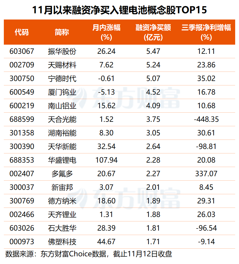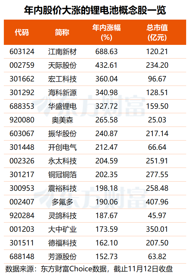行业大额长协订单频现 除了龙头新产品突破,就整个锂电行业来看,产业链正迎来前所未有的需求共振,最突出表现就是上游原材料涨价和电池企业提前“锁单”。 价格方面,11月11日,电池级碳酸锂现货价格报8.24万元/吨,较6月份触及的低位上涨37.59%。六氟磷酸锂则以“一天一价”的态势搅动产业链,目前部分市场报价高达15万元/吨,主流成交价较10月中旬已翻倍。 订单方面,11月12日晚间,头部储能公司海博思创公告称,公司与宁德时代签署战略合作协议。协议明确,2026-2028年,公司采购电量累计不低于200GWh,宁德时代确保按公司需求量纲供应。 就在一周前,嘉元科技与宁德时代签订框架协议,宁德时代未来三年计划向嘉元科技采购电池负极集流体材料,嘉元科技应确保按照不低于合计62.6万吨产能的要求优先保障宁德时代产品需求并提供有竞争力的价格方案。 电解液龙头天赐材料近日连发两则公告,2026-2028年,天赐材料将向中创新航供应72.5万吨电解液产品,子公司九江天赐将向国轩高科供应87万吨电解液产品。 此前,格林美与厦钨新能签署先进电池原料和材料供应的战略合作框架协议,双方约定2026-2028年,格林美预计每年将向厦钨新能供应电池原料与材料产品15万吨。丰元股份子公司与楚能新能源方面签订合作框架协议,约定未来三年内,由丰元锂能向楚能新能源供应磷酸铁锂正极材料产品10万吨。 机构看好行业前景 数据显示,2025年1-9月,我国新能源汽车销售1119.60万辆,同比增长34.55%,合计占比46.03%,其中出口175.80万辆,同比增长89.4%;我国动力和其他电池合计产量1121.90GWh,同比增长51.40%,其中出口199.90GWh,出口占累计销量的18.7%。 业绩方面,据中原证券统计,2025年前三季度锂电池板块营收1.78万亿元,同比增长12.81%,增速较2024年显著提升。动力电池装机量494.10GWh,同比增长42.52%;而储能需求超预期,前三季度我国储能锂电池合计出货430GWh,同比增长99.07%,占锂电池总出货量的34.15%。 华泰证券分析认为,国内储能迎来四季度并网高峰,国内新能源车由于明年免购置税政策退坡而抢装,欧洲新能源车销量持续提速,美国AI基建带动储能需求,锂电产业链景气度持续向上。 该券商指出,需求向好叠加供给显著放缓,储能电池及多数锂电材料供需已出现阶段性偏紧,电池、六氟磷酸锂、磷酸铁锂、负极率先迎来拐点,看好锂电产业链材料各环节盈利改善,实现量利齐升。 杠杆资金抢筹这三股 东方财富概念板块显示,目前A股市场共有402只锂电池概念股,合计总市值达10.36万亿元,超九成锂电池概念股年内股价上涨,51股年内股价已翻倍;江南新材、天际股份、宏工科技、海科新源、华盛锂电区间涨幅居前,其中,江南新材累计上涨近700%。 业绩方面,超半数锂电池概念股今年前三季度业绩报喜,净利增幅超100%的有74股,科力远、国轩高科、多氟多等净利同比增幅在4倍以上,晶瑞电材以19202.65%的增幅居首。 ![]() 东方财富Choice数据显示,11月以来,共有169只锂电池概念股获融资净买入。其中,35股融资净买额超1亿元,振华股份、天赐材料、宁德时代位居前三,融资净买额均超5亿元。 主力资金方面,月内共有40余股获主力资金净流入超1亿元,其中,南山铝业获主力资金抢筹逾11.5亿元,万华化学、胜利精密、诺德股份、兆新股份主力净流入资金规模均超5亿元。 ![]() (文章来源:东方财富研究中心) |