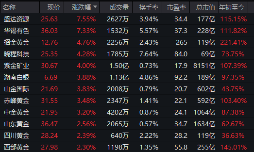 消息面上,自10月14日至11月10日,碳酸锂期货价格持续上涨,累计涨幅达20%。据了解,近期磷酸铁锂行业生产积极性高涨,头部材料厂多处于满产甚至超产状态。业内人士称,目前这种供需两旺的态势有望延续至年末。 近期,六氟磷酸锂价格大涨,目前部分市场报价高达15万元/吨,主流成交价较10月中旬已翻倍。业内人士指出,本轮六氟磷酸锂涨价的核心原因是供需错配:一方面,下游市场需求迎来爆发式增长;另一方面,大量中小企业在亏损压力下加速退出,导致供给端收缩,加之短期有效产能难以快速释放,进一步加剧了供需矛盾。 华泰证券指出,2026年基础化工板块有望迎来上行起点,建议关注内外需韧性和格局改善品种。随着2025年6月以来行业资本开支增速显著下降,叠加“反内卷”有望助力供给端协同及落后产能出清,而内需有望进一步复苏及出口亚非拉等支撑需求,大宗化学品有望逐步复苏。 贵金属概念股震荡拉升 贵金属概念股震荡拉升,盛屯矿业涨停,盛达资源、华锡有色、招金黄金等跟涨。 ![]() 消息面上,当地时间11月12日,国际贵金属期货普遍收涨,COMEX黄金期货涨2.07%,报4201.4美元/盎司;COMEX白银期货涨4.90%,报53.23美元/盎司。 (文章来源:中国基金报) |