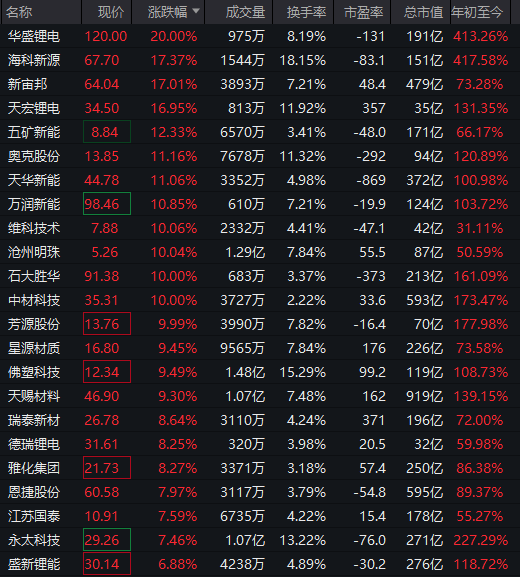 【导读】锂电池板块强势拉升,多股涨停 一起来看最新的市场情况及资讯。 11月13日开盘,A股三大指数小幅低开,随后震荡拉升。 从板块来看,锂电池及相关产业链大涨,精细化工、贵金属、存储器等板块震荡拉升,而能源设备、天然气、通信设备等板块跌幅居前。 港股方面,三大指数震荡走低,腾讯音乐大跌超12%,京东集团、理想汽车、阿里巴巴等跟跌。 锂矿概念股集体拉升 锂矿概念股早盘集体拉升,华盛锂电20%涨停,海科新源、新宙邦、天宏锂电等涨幅居前,沧州明珠、中材科技等多股涨停。 ![]() 其中,石大胜华直线拉涨停,实现2连板。